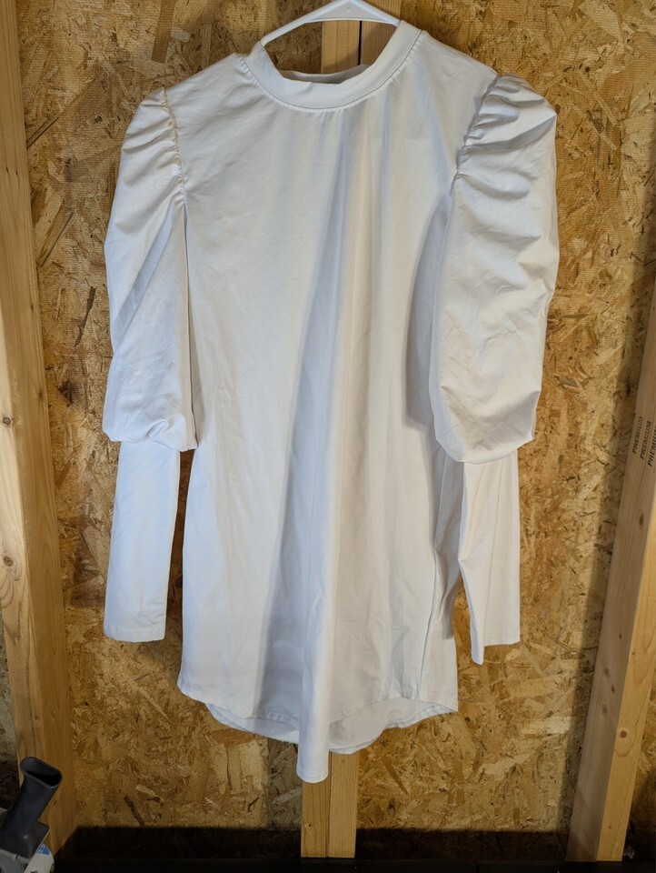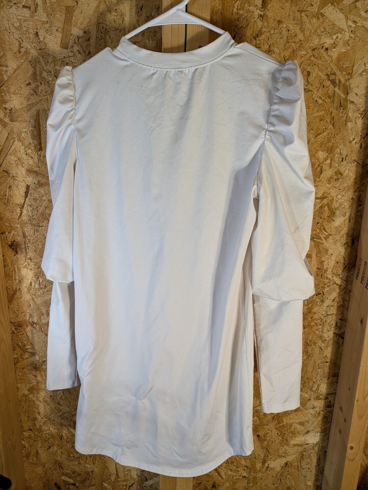 This is a size small white dress from Veiled Collection. It features a solid pattern, long puff sleeves, a crew neckline, and a pullover closure. Made of cotton knit fabric, this mini dress is suitable for parties, formal occasions, summer, and spring wear. It is machine washable and is not vintage or handmade.