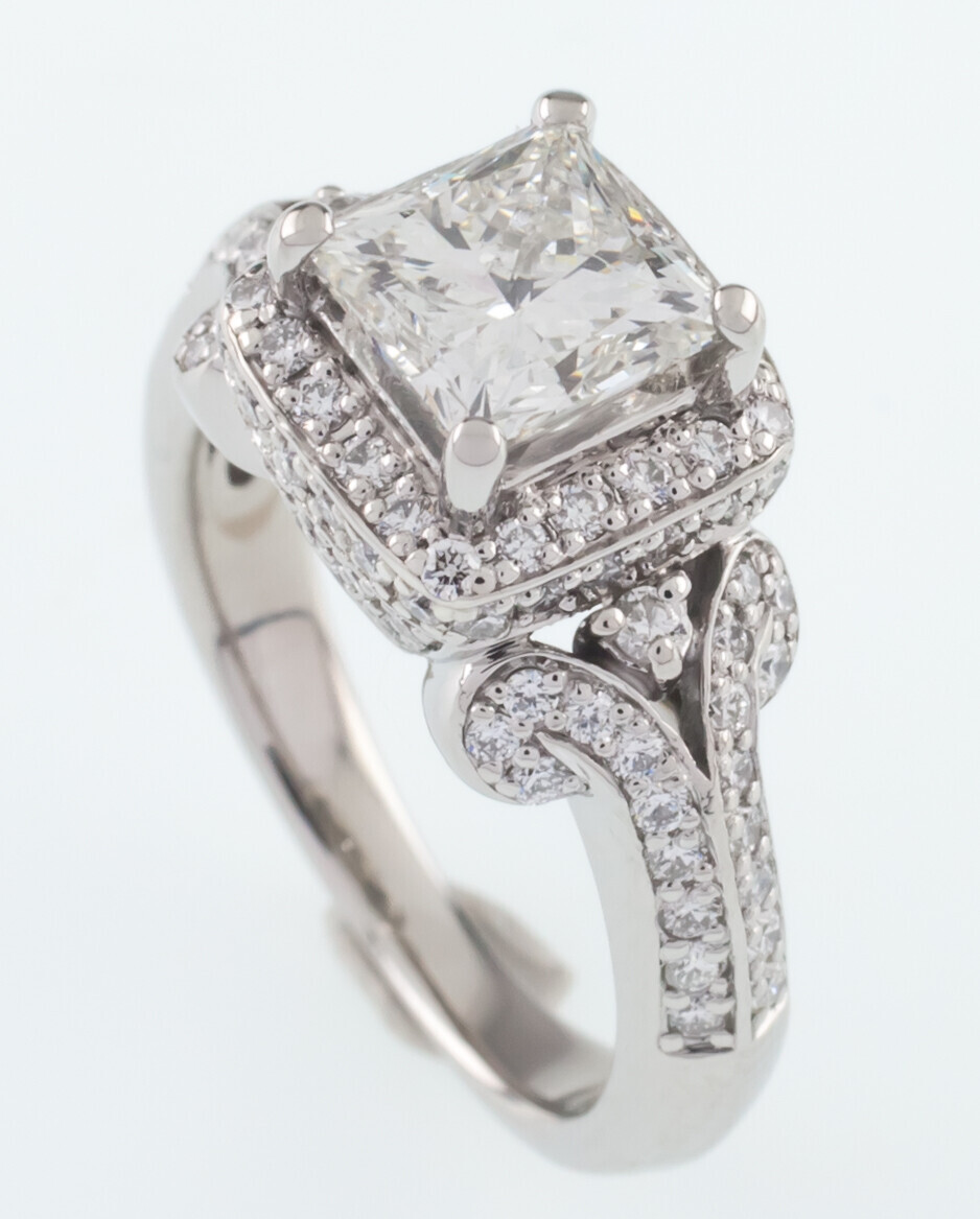 Features Princess Cut Solitaire in Bucket Setting w/ Round Accent Stones in Bezel, Bucket, and Band
