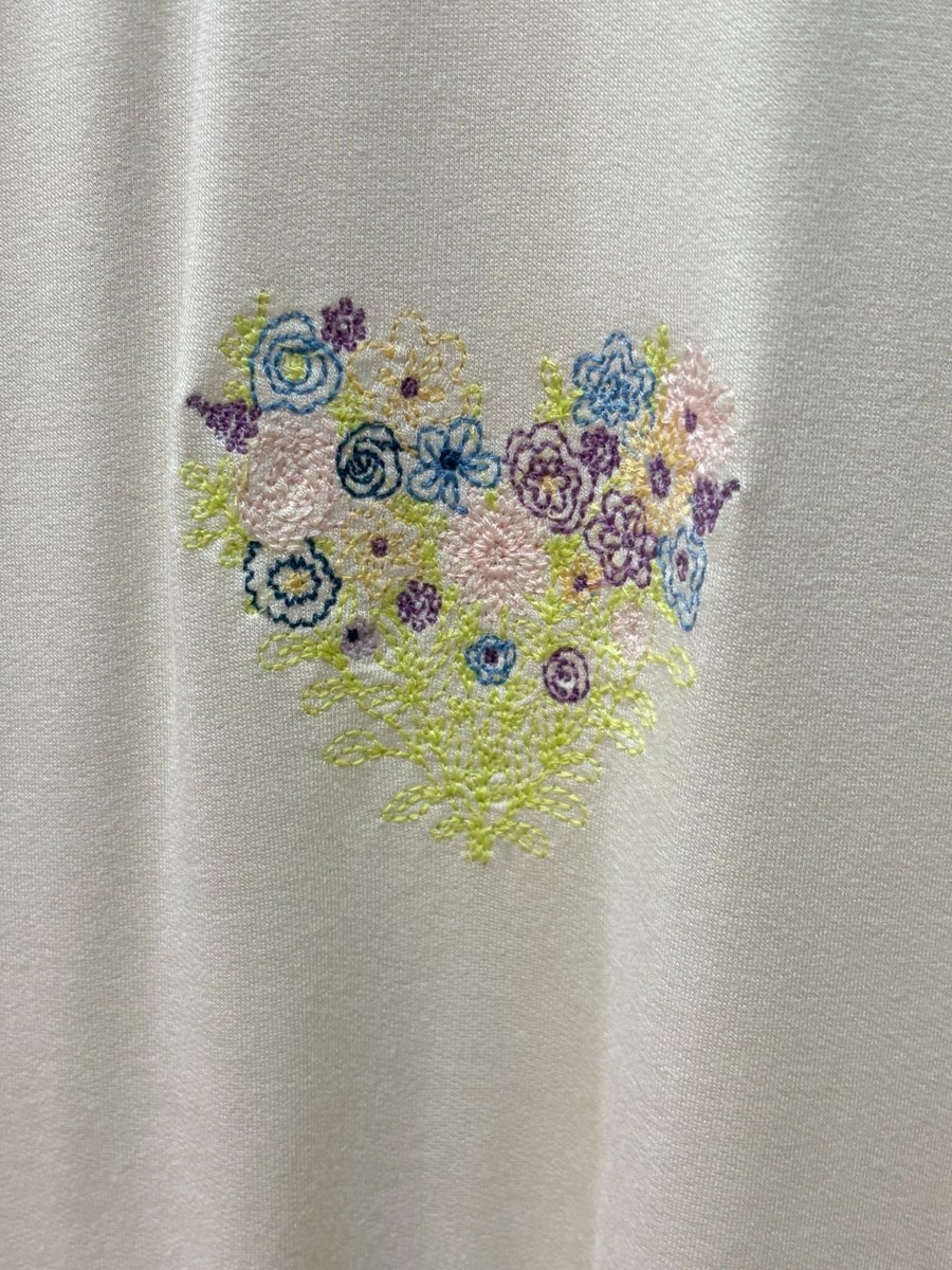 This delicate blouse tells a tale of charm and comfort, with its embroidered heart of flowers atop a soft cream fabric. The ruffle sleeves add an air of graceful movement, making it a delightful addition for days of effortless elegance. Crafted to blend style and softness seamlessly.