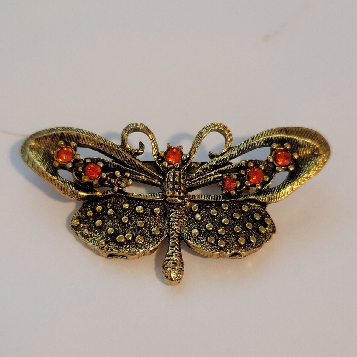 This vintage gold tone butterfly brooch features beautiful orange rhinestones set in an ornate, textured wing design. The openwork upper wings and dotted lower wings give the piece charming detail and depth. A classic rollover clasp secures the brooch to jackets, scarves, hats, or bags. Perfect for collectors, nature jewelry lovers, or anyone who enjoys bold, whimsical accessories.