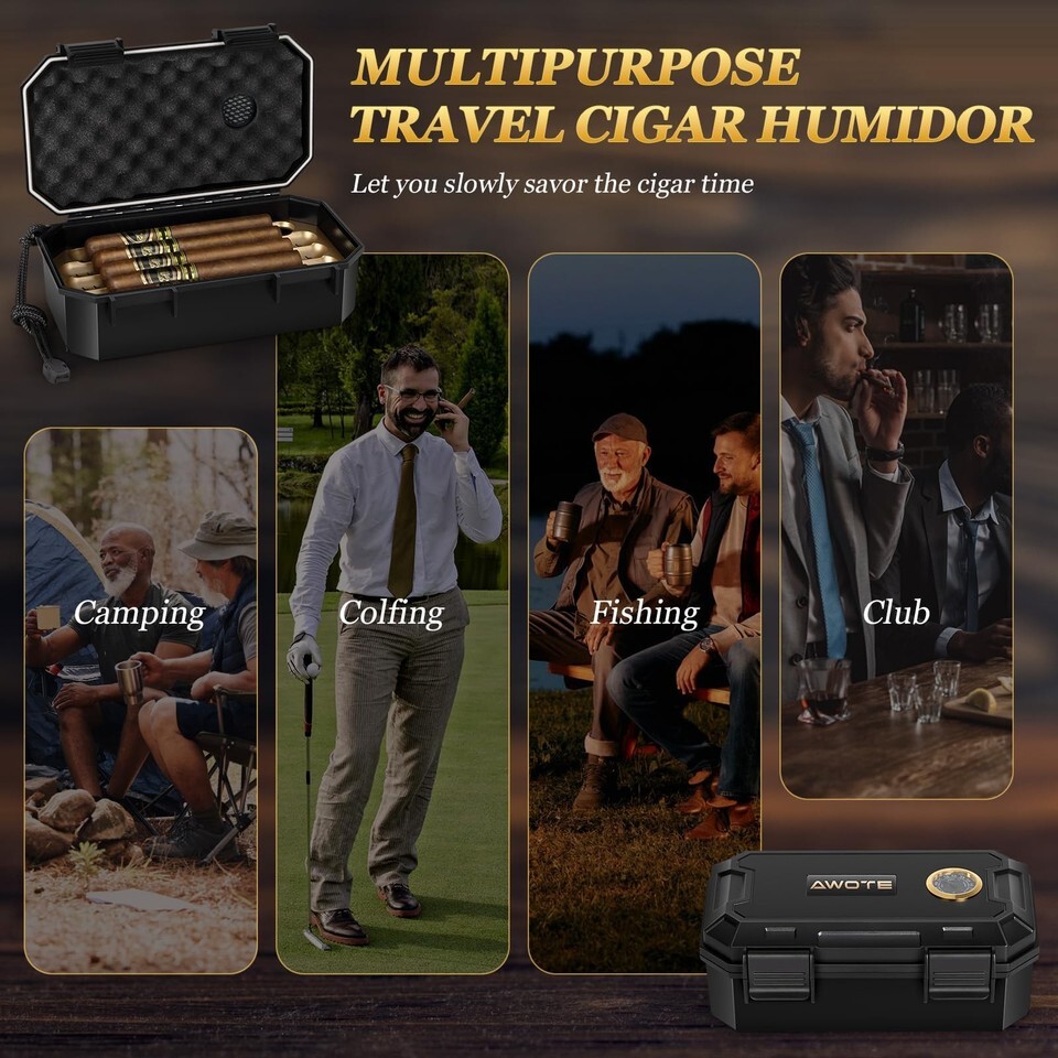 ?Portable Travel Design?This cigar case measures 8.26 x 4.33 x 3.35 in with a hand rope and weighing only 1.32 pounds, this travel cigar case is lightweight and easy to carry. It is made of high quality ABS material and comes with a sponge cushion to protect your cigars from bumps and bruises on the road. The well-designed sealing ring and reliable locking clasp make it waterproof and drop-proof, ensuring that the original flavor of the cigar is perfectly preserved