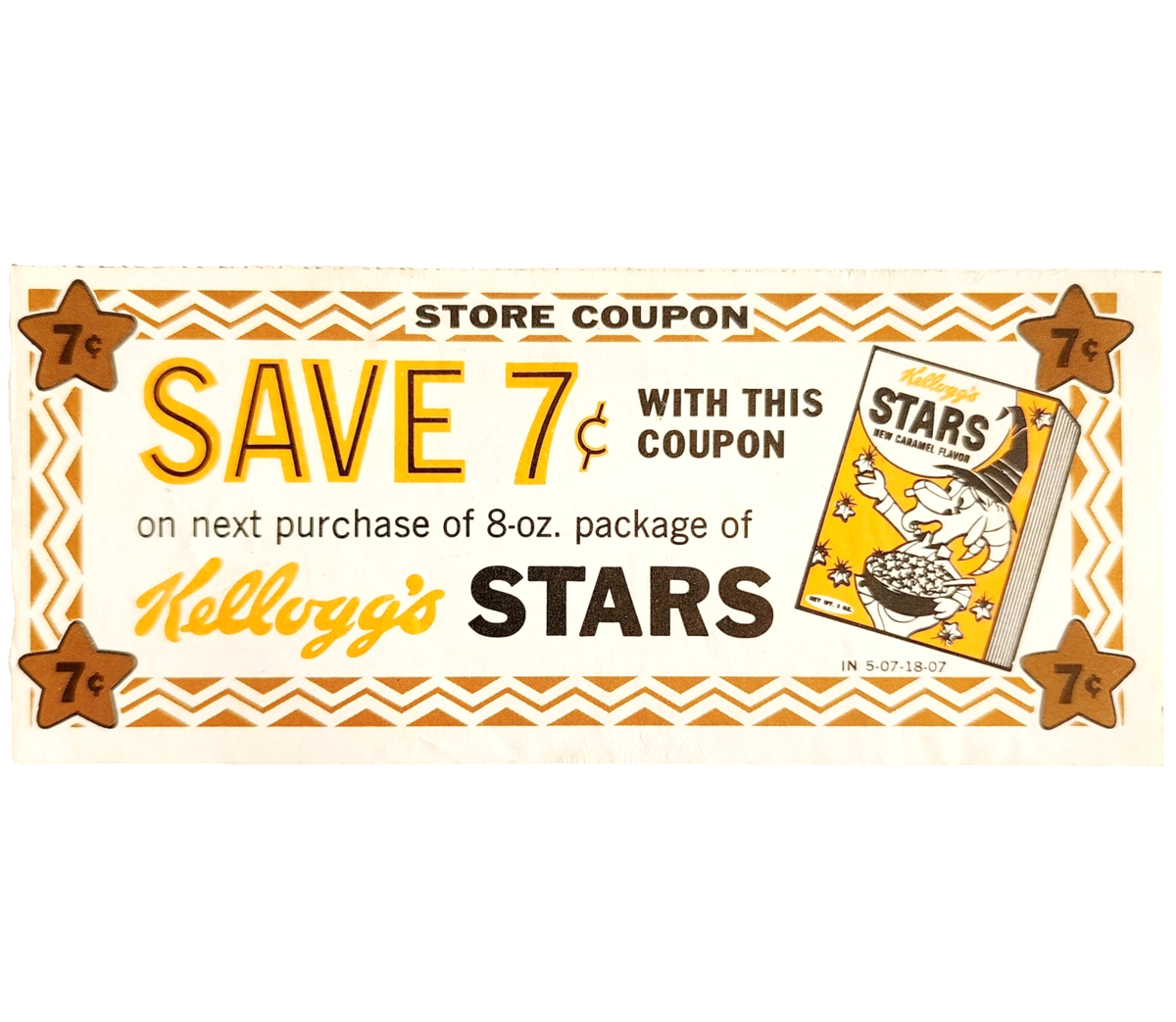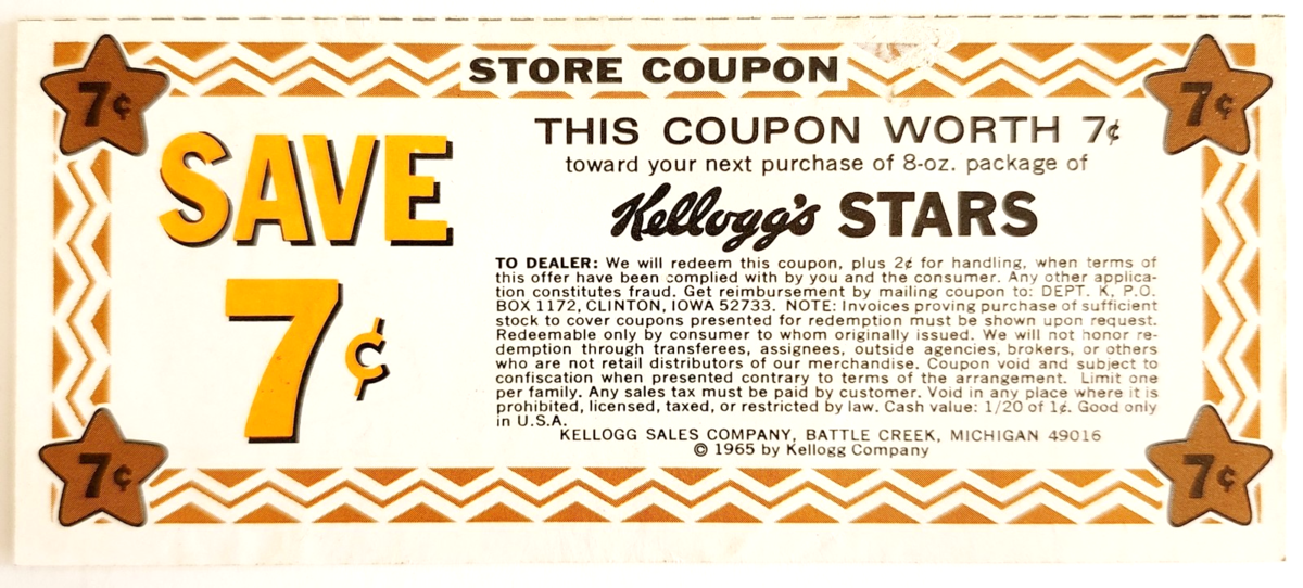 1965 Kellogg's Stars Breakfast Cereal Coupon 7 Cents Vintage Ephemera F6N