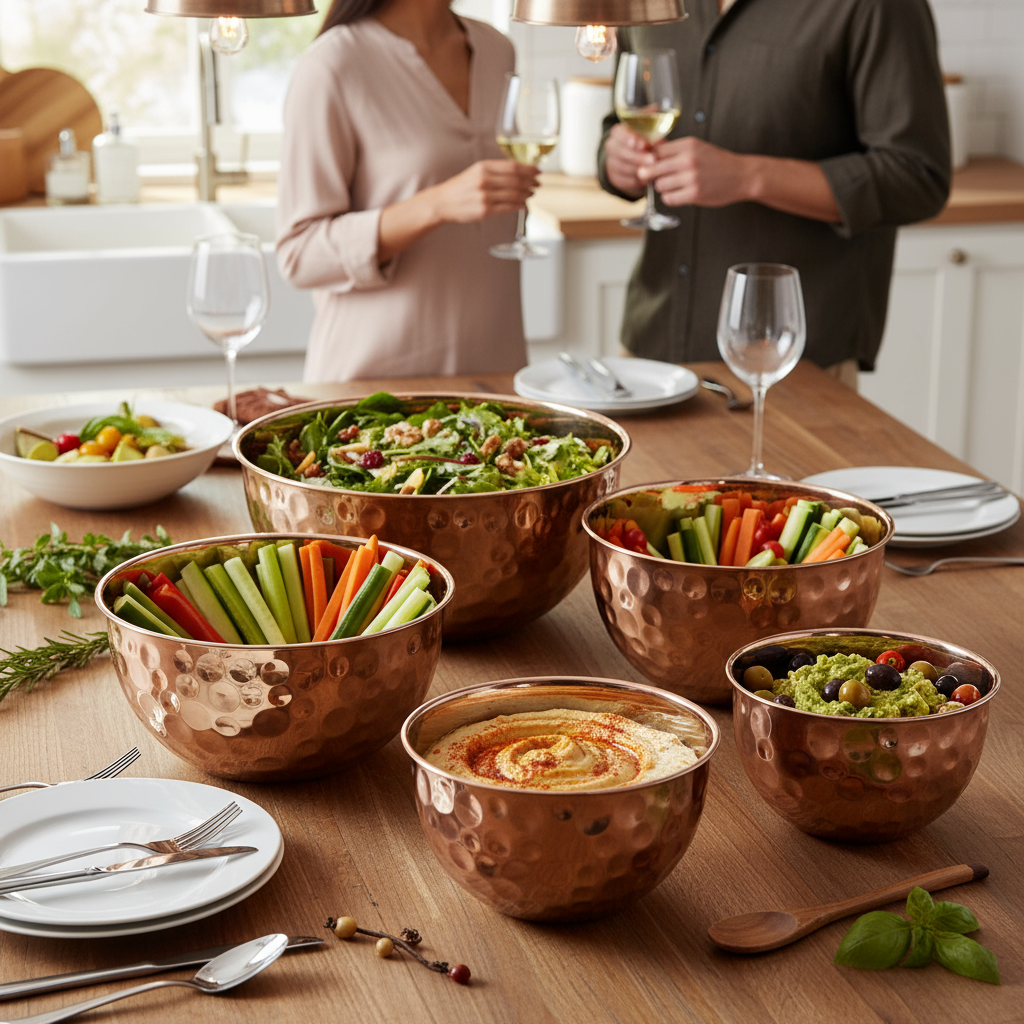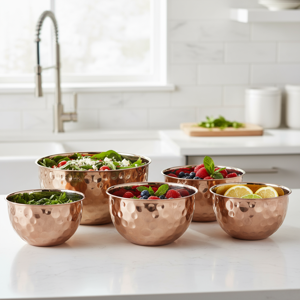 These versatile bowls are crafted from sturdy yet lightweight stainless steel, ensuring they withstand daily use while maintaining their mirror-polished shine. Perfect for a variety of tasks, from marinating meats and tossing fresh salads to mixing batters, storing ingredients, or serving appetizers and dips, this set adapts effortlessly to your culinary needs.