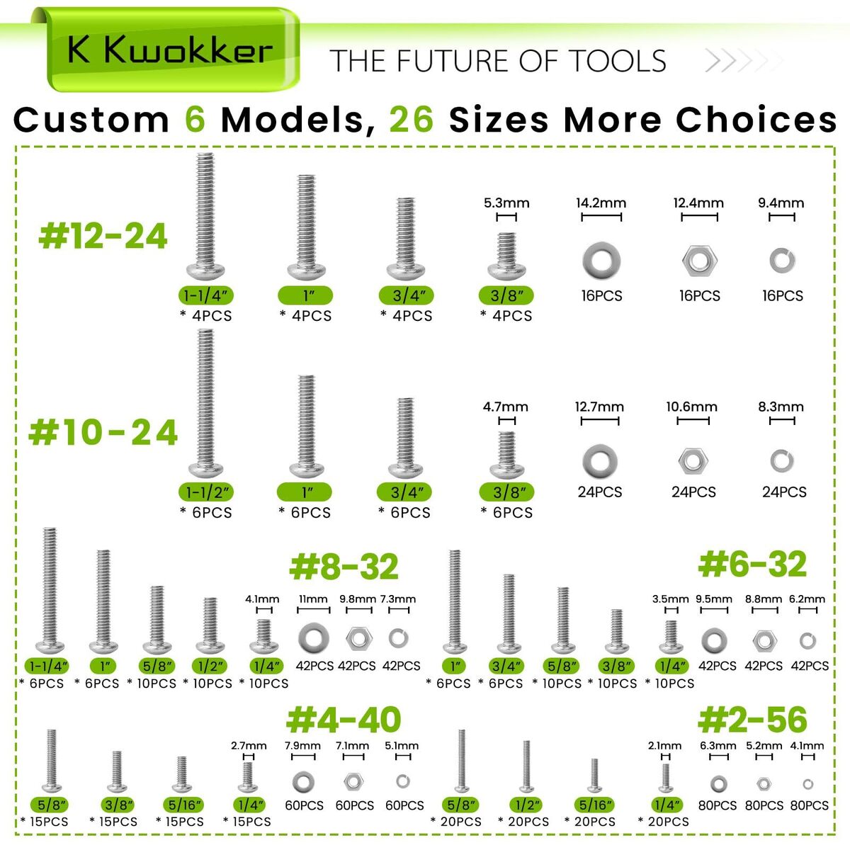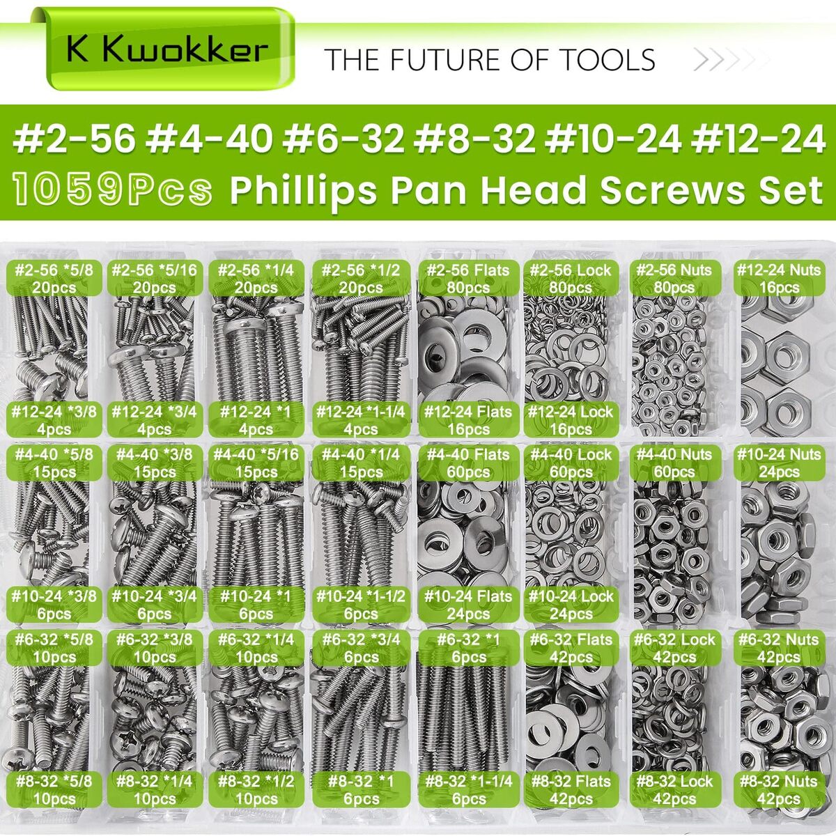 1059 Pcs Larger Quantity, Various #2-56 #4-40 #6-32 #8-32 #10-24 #12-24 Assorted Screws with Nuts, Flat Washers and Lock Washers: Nice set screw assortment kit. 80 x 2-56 Screws, 80 x Nuts, 80 x Washer, 80 x Lock Washer; 60 x 4-40 Screws, 60 x Nuts, 120 x Washers; 42 x 6-32 Screws, 42 x Nuts, 84 x Washers; 42 x 8-32 Screws, 42 x Nuts, 84 x Washers; 24 x 10-24 Screws, 24 x Nuts, 48 x Washers; 16 x 12-24 Screws, 16 x Nuts, 32 x Washers; 2 Hex keys; 1 Tweezers; 1 nut and bolt organizer