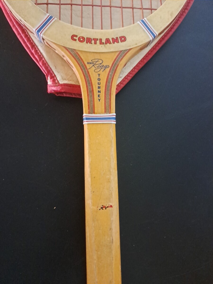 The Wood Bobby Riggs Cortland Tennis Racquet Tourney with a tight frame and 4 5/8 grip size is a vintage collectible wooden racquet, sold with its original cover. These racquets typically date from the 1950s?60s and are valued by collectors for their association with tennis legend Bobby Riggs and the Cortland brand.