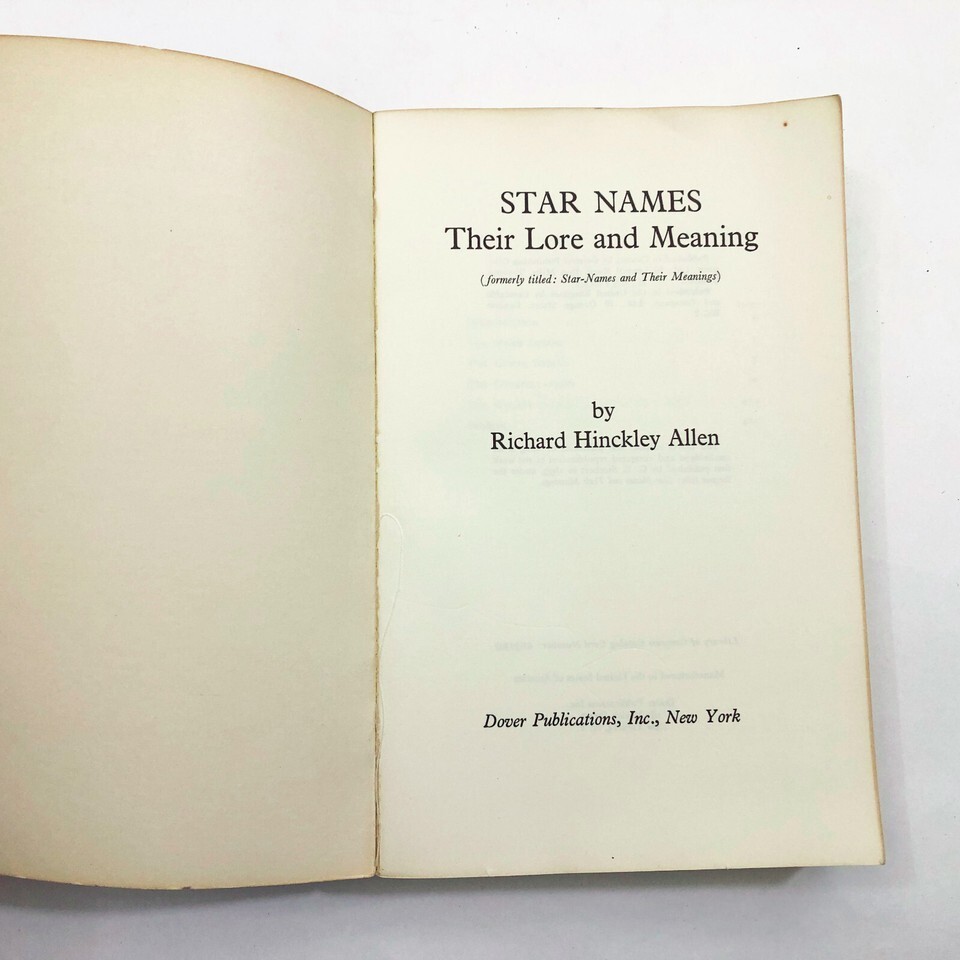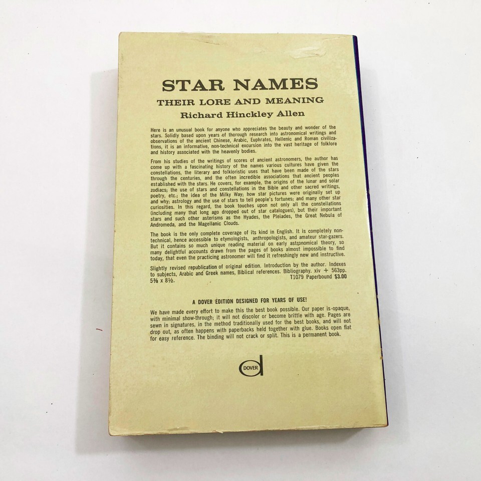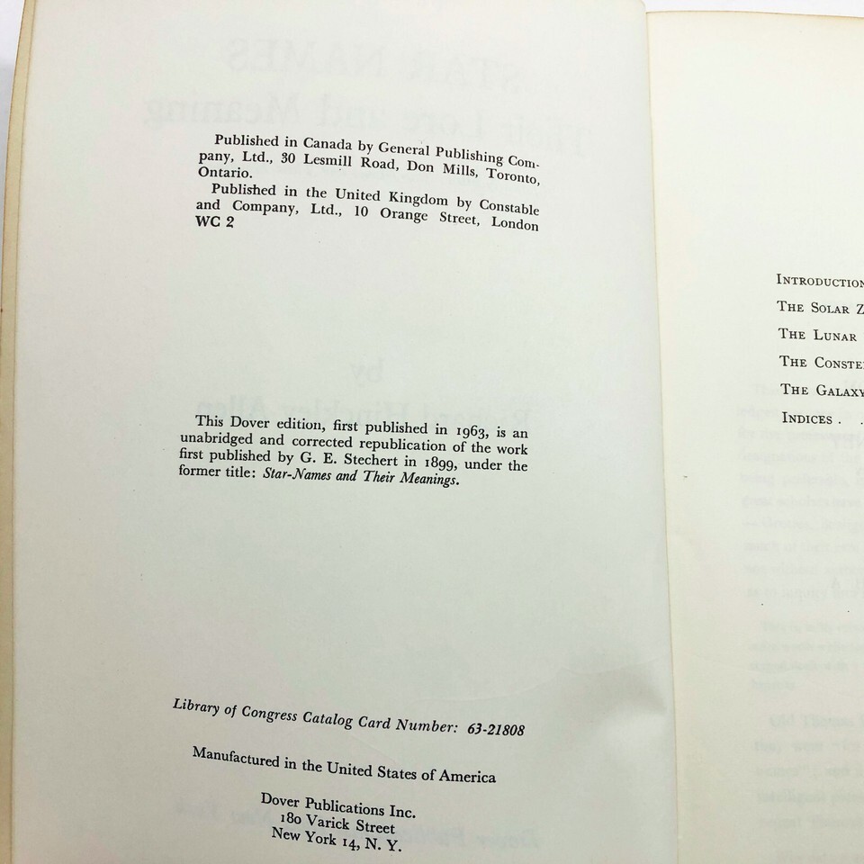 This Dover edition, first published in 1963 , is an unabridged and corrected republication of the work first published by G. E. Stechert in 1899, under the former title" Star-Names and Their Meanings".