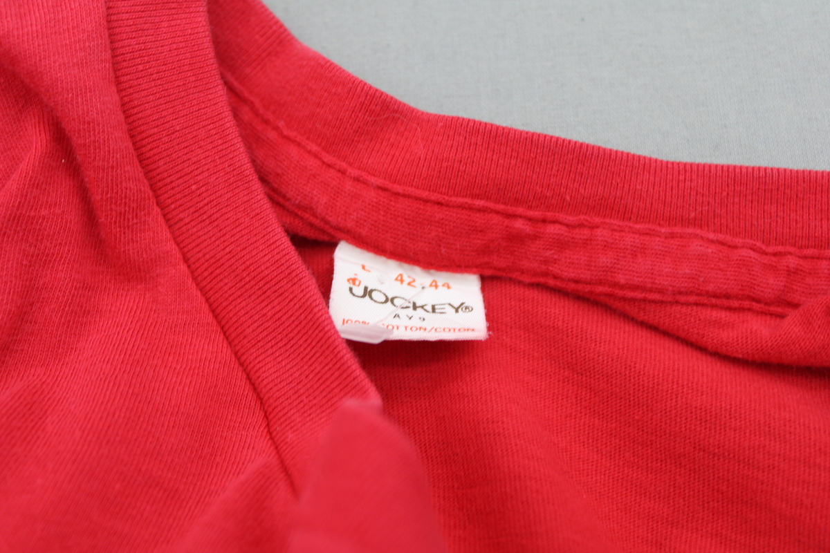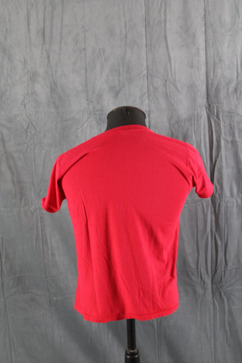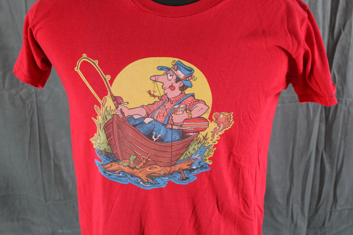 Up for sale is a vintage graphic t-shirt. It has a red base colour with an iron on graphic of a fisherman in a boat on the chest. What a great shirt do not miss out on it.