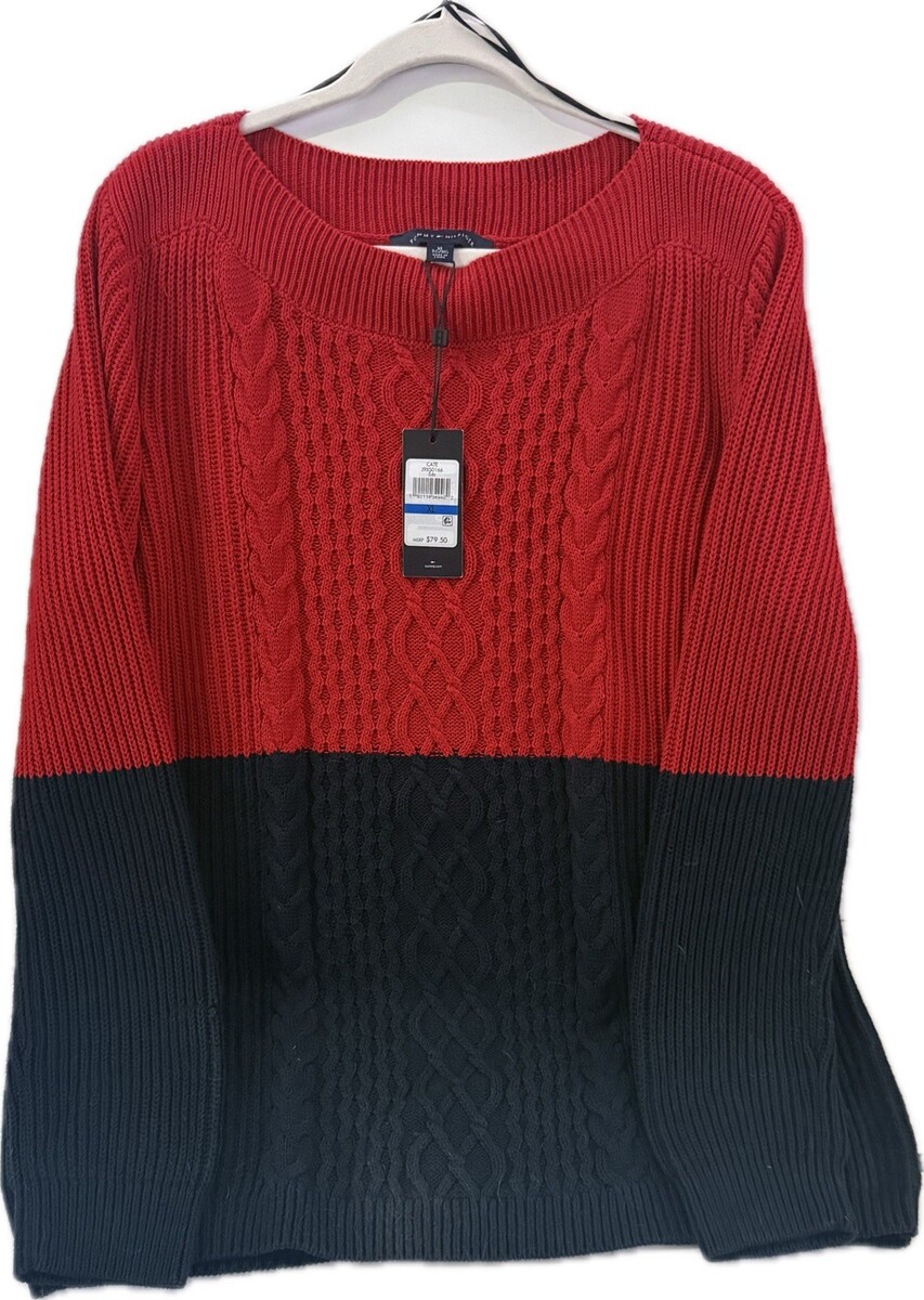 This Woman's Tommy Hilfiger Pull Over Sweater in size XL is a stylish and cozy addition to any woman's wardrobe. Made from polyester knit fabric, this Red/ Blue sweater features long sleeves and a pullover style, perfect for casual occasions during the winter and fall seasons. With the iconic Tommy Hilfiger brand, this sweater is machine washable for easy care. Stay warm and fashionable with this Tommy Hilfiger sweater.
