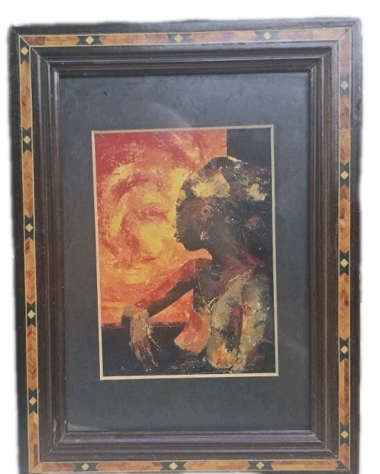 The Woman by the Window art print by Nigerian artist Bayo Iribhogbe captures a vintage and unique perspective of a African woman looking out a window. This medium-sized framed high quality print showcases intricate detail in colors. The framed artwork measures 4 inches in length and height, making it a charming addition to any art collection or home decor inspired by African themes and women's subjects.