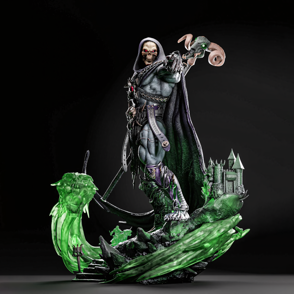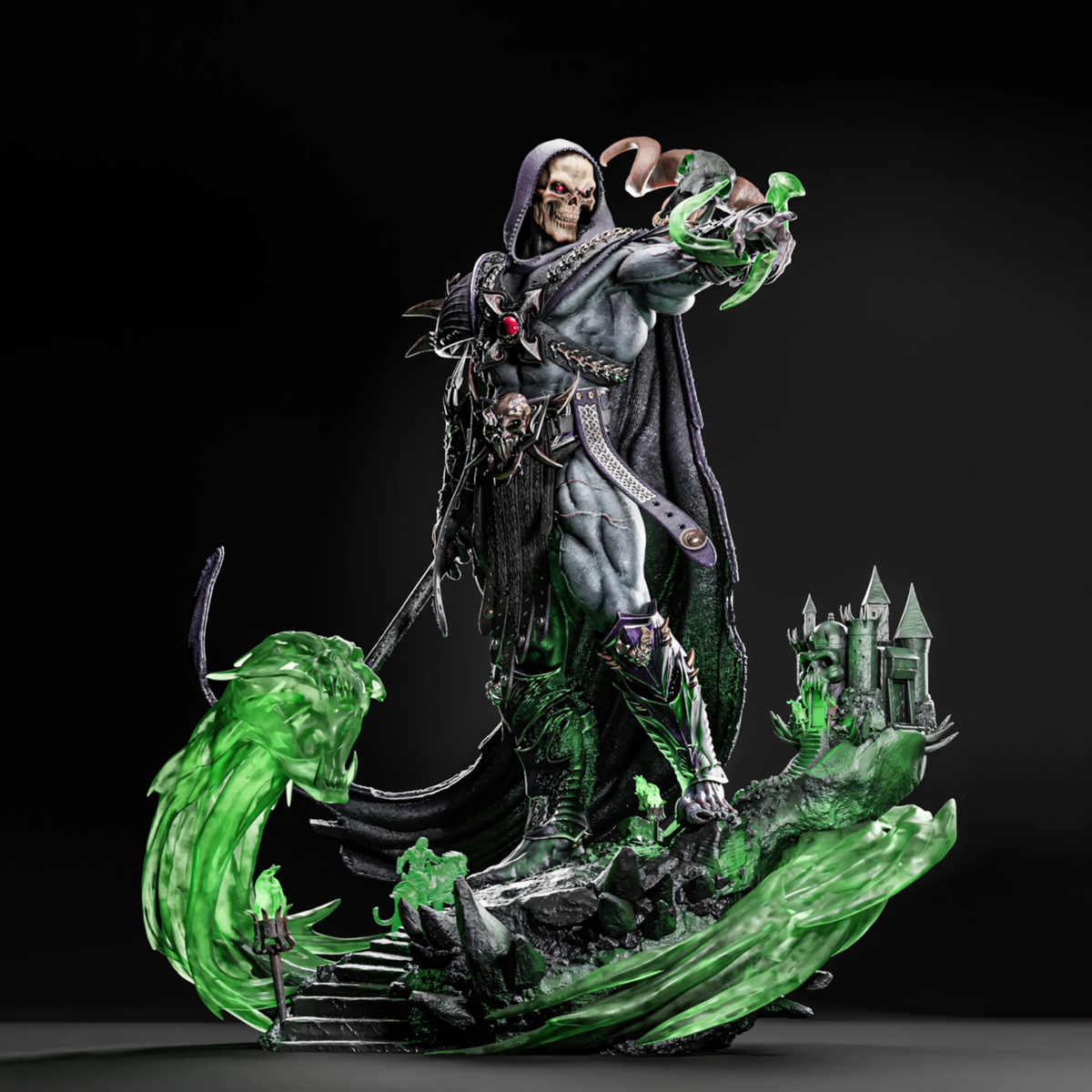 Skeletor rises in this 1/6 scale fanart STL statue — a dark sorcerer commanding spirit energy through his staff. Every sculpted muscle, armor plate, and skull motif radiates dark power, supported by a swirling Spirit Power Base for a menacing display.