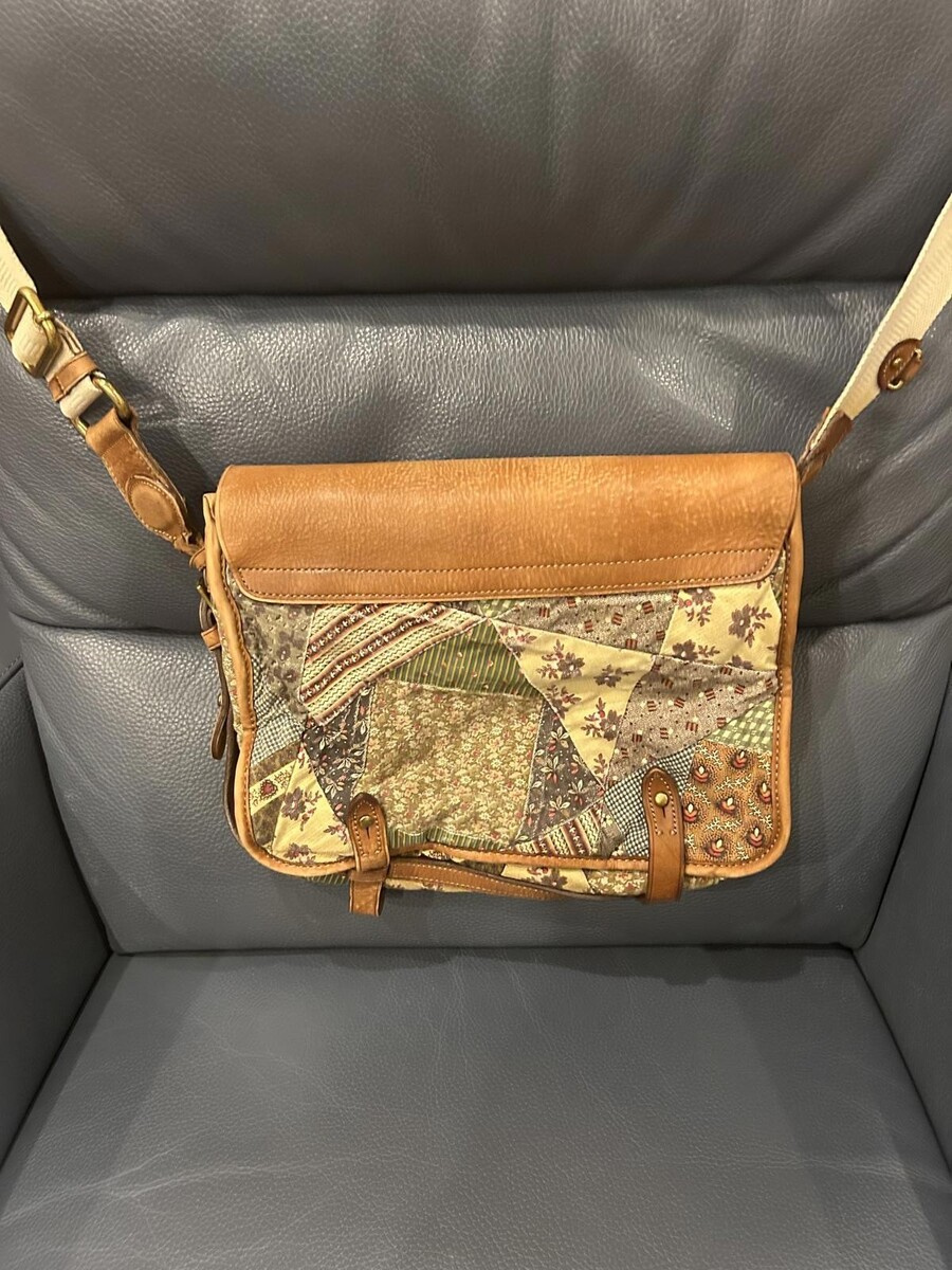Features a mix of tan leather and patchwork fabric with decorative stitching.