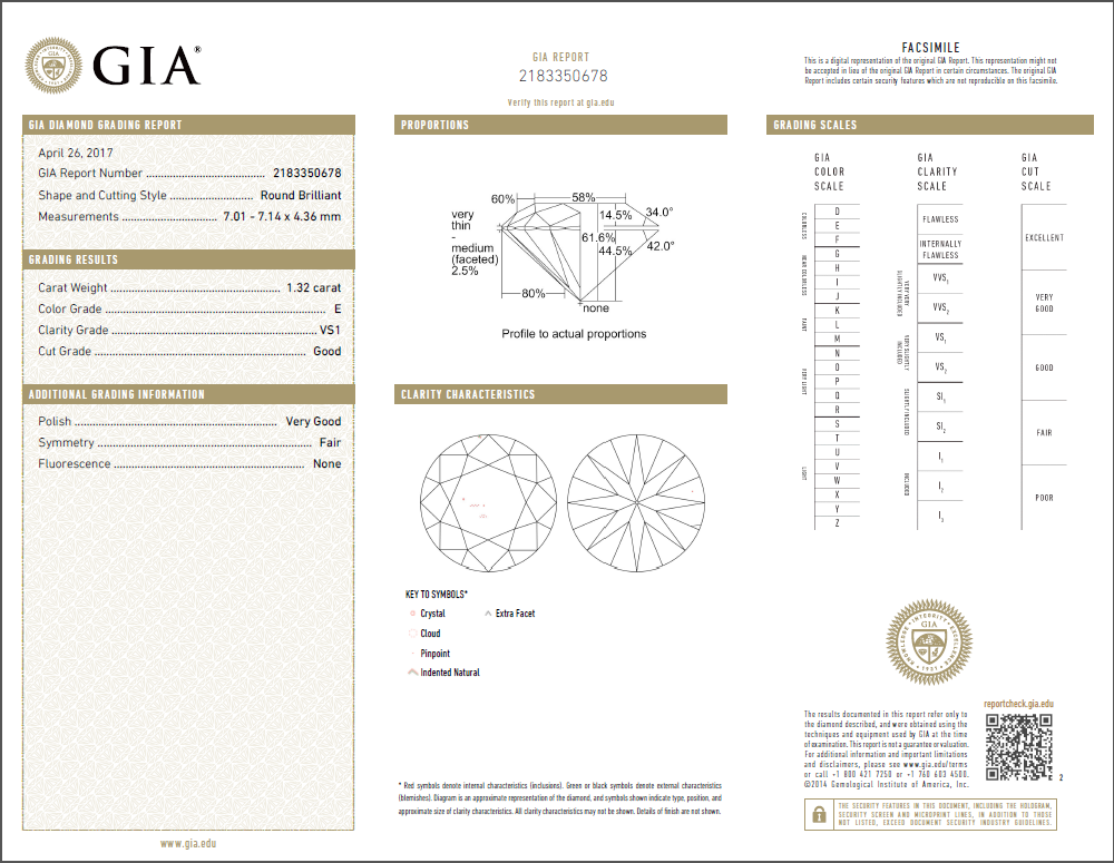 1.32 Carat Loose E / VS1 Round Brilliant Cut Diamond GIA Certified Diamond General Info GIA Report Number: 2183350678 Diamond Cut: Round Brilliant Measurements: 7.01 - 7.14 x 4.36 mm Diamond Grading Results Carat Weight: 1.32 Color Grade: E Clarity Grade: VS1 Additional Grading Information Polish: Very Good Cut: Good Symmetry: Fair Fluorescence: None This Diamond is guaranteed authentic, non-treated and natural. All items are professionally packaged and shipped. All shipments include insurance and delivery confirmation or signature confirmation. Local Pick-up is available in our showroom. (Contact us for payment methods to pay on pickup.) California Buyers: 9.5% sales tax will be added. Returns Policy: About Us: Continental Coin and Jewelry Company Web Department: Monday - Frid