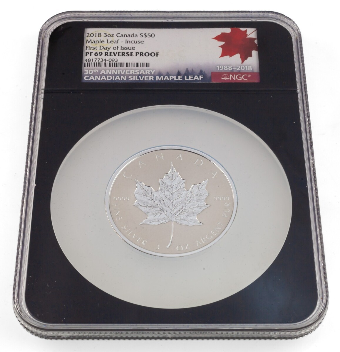 2018 Canada 3 once. Foglia d'acero argento S$50 - Incuse NGC PF69 FDOI a prova inversa