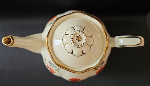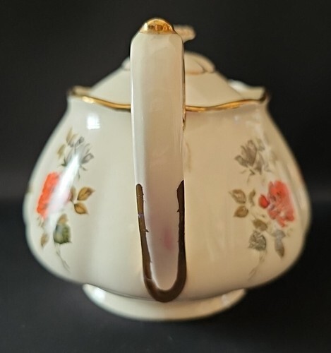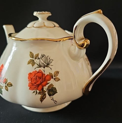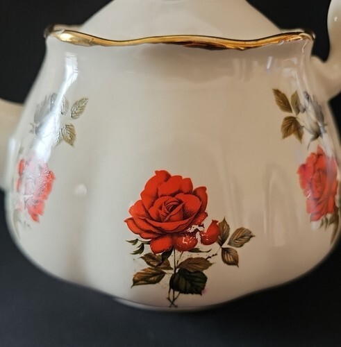 UP FOR SALE: Vintage 1970s Arnel's Ceramic Teapot Red Rose Transferware with Gold Detailing
