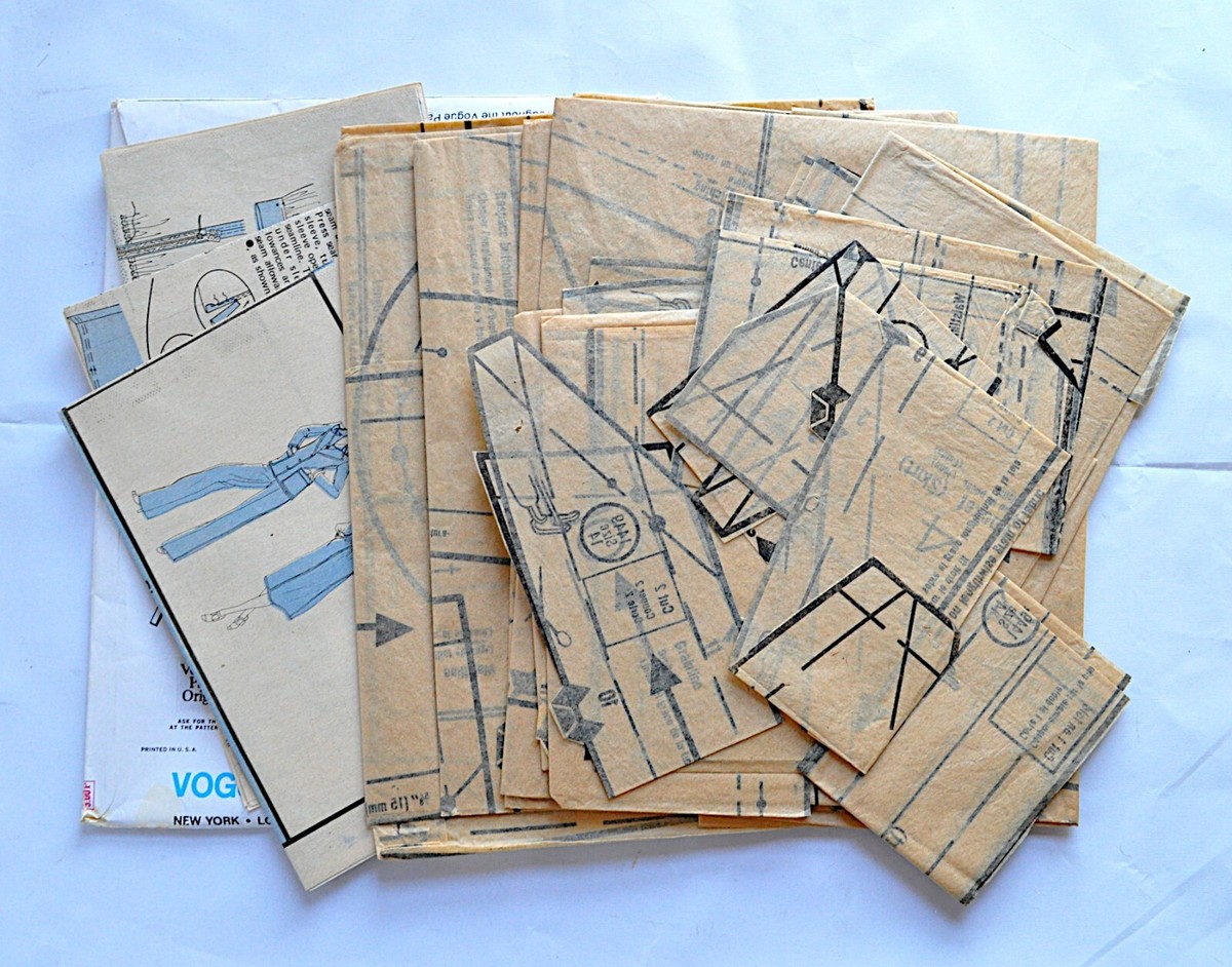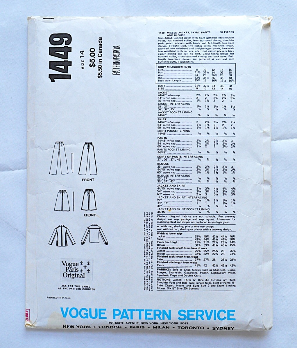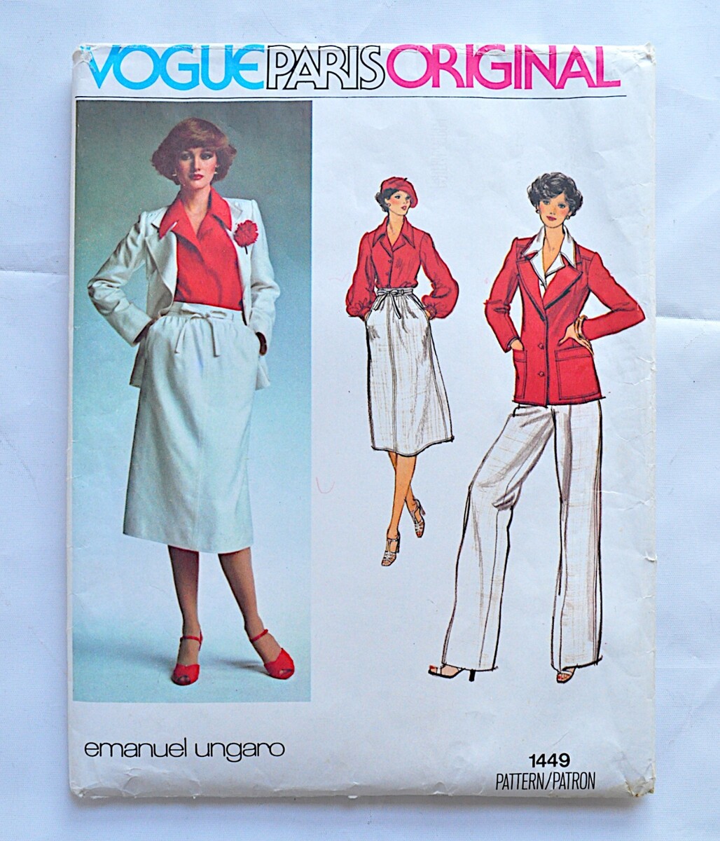 Vintage Vogue Paris Original sewing pattern #1449 in size 14, designed by Emanuel Ungaro. Pattern sketch on back shows only three pieces, but the pattern is for the entire outfit pictured on the front: suit with unlined jacket, pants and/or skirt with belt, plus a long sleeved blouse. Skirt pants pieces have been cut out and used, but I counted every piece and it is complete, including three sheets of instructions.