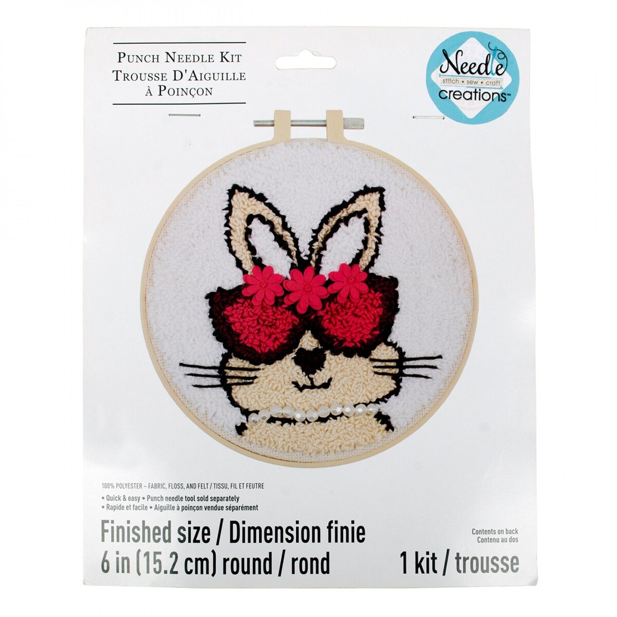 Needle Creations Bunny 6 Inch Punch Needle Kit. Punch Needle Kit. 100 Percent Polyester Fabric, Floss, and Felt. Quick and easy. Package Contents: 1 Fabric Panel, 5 Floss Colors, Plastic Beads, 1 Felt Color, 1 Plastic Embroidery Hoop, 1 Needle, and Instructions. Kit requires a 2.2 mm adjustable punch needle tool with threader to make the kit. Sold separately. Kit requires a basic knowledge of punch needle. Finished Size: 6 Inch Diameter. CHK-NC-PNND-BUNNY