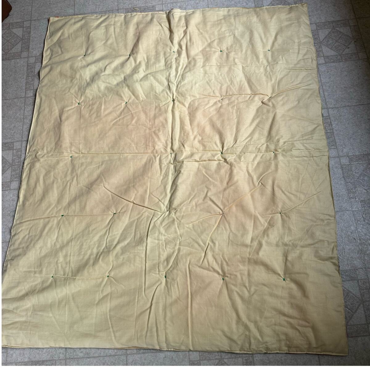 CONDITION: fabric "picks" on back edge (see last pic), one of the green yarn ties is missing, quilt is clean