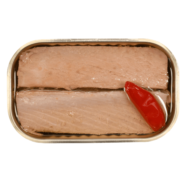 Hand-prepared tuna loin, placed in the can with fresh piri-piri.