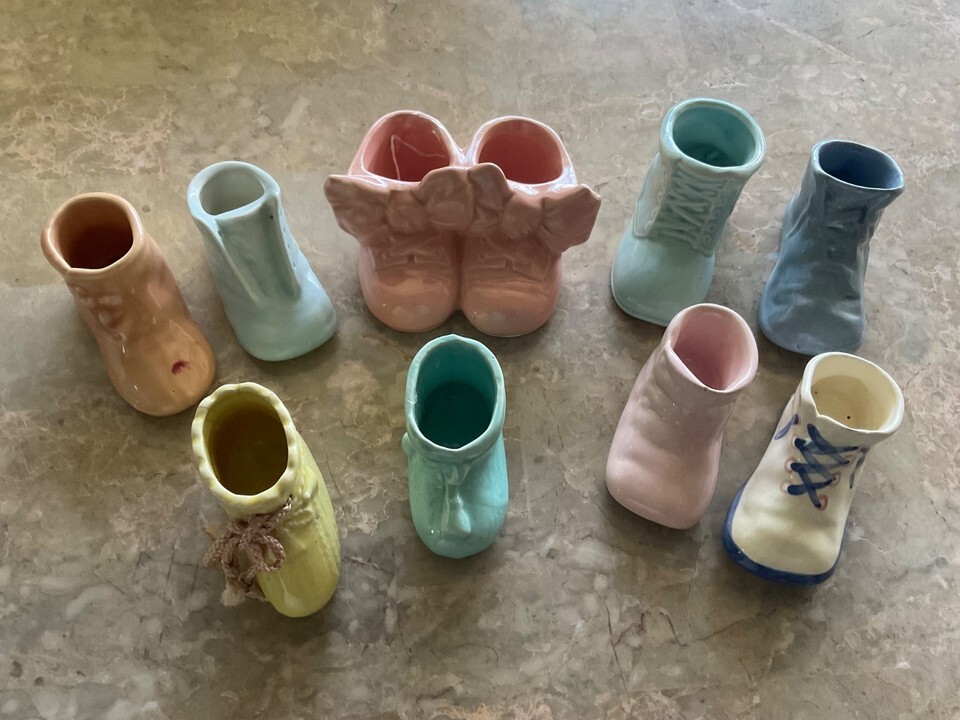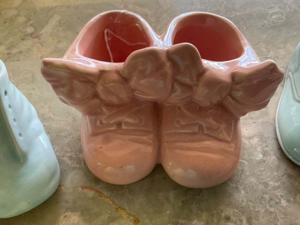 The Vintage Ceramic Baby Shoes are a charming and unique planter in the shape of baby shoes, perfect for adding a touch of whimsy to any space. Made of ceramic, these shoes are not only functional for holding plants or potpourri, but also make a lovely decorative collectible for those who appreciate vintage items. The theme of these shoes specifically focusing on a baby adds a special sentimental touch, making them a great addition to a nursery or playroom.