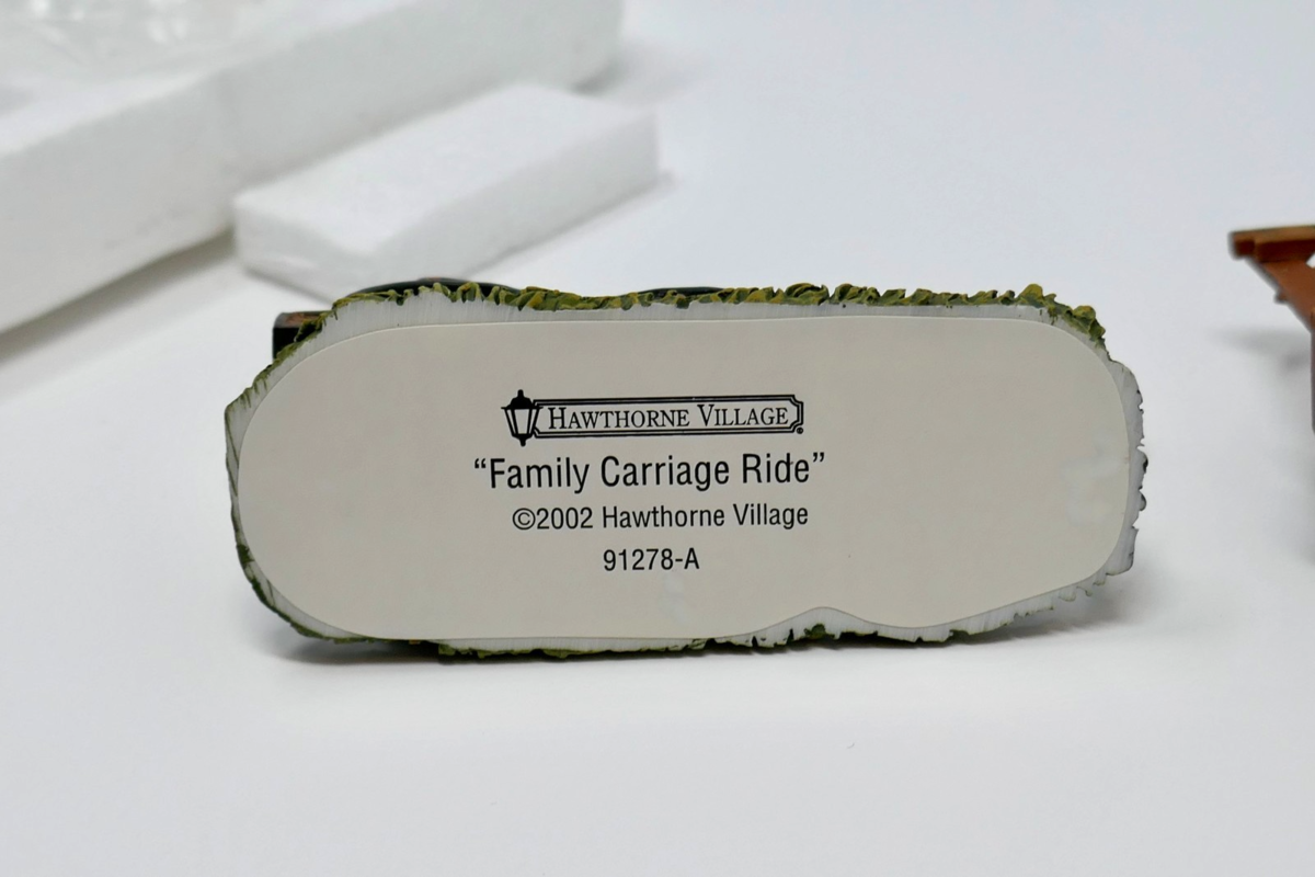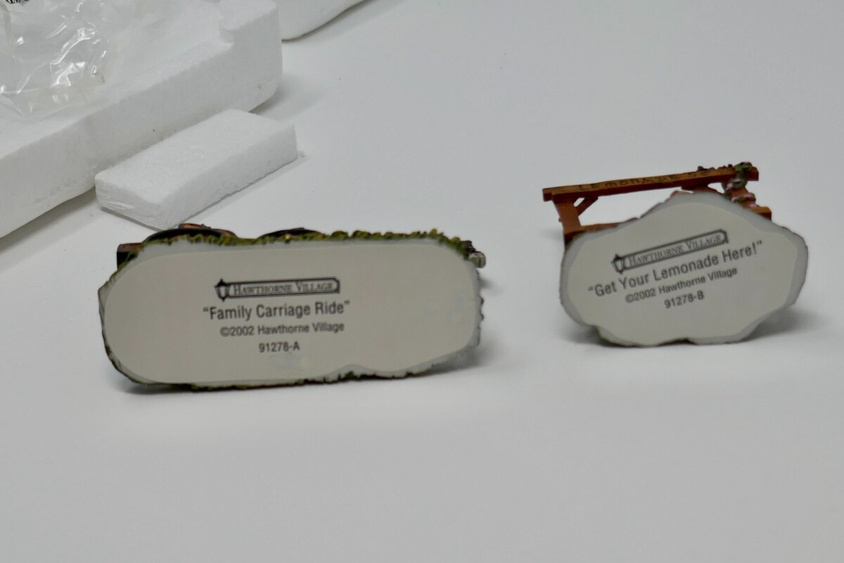 The Hawthorne Village 2002 Accessories feature Family Carriage Ride and Get Your Lemonade figures. Packaged in the styrofoam, this original 2002 release is part of the Hawthorne Village collection and is perfect for any room in the house during the holiday season.