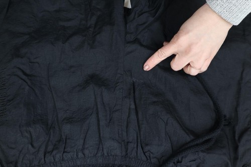 Cuffs stretched. Blemishes front both legs. Inner lining discolored/pilled
