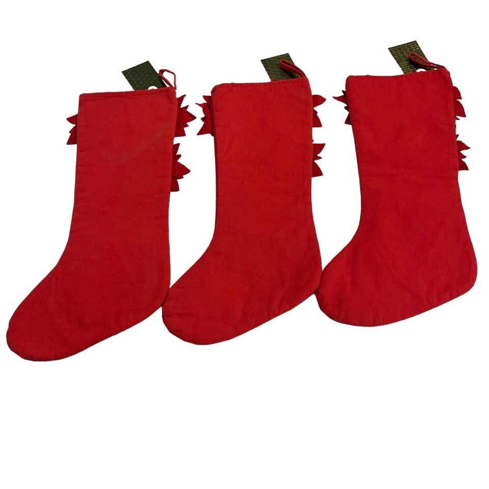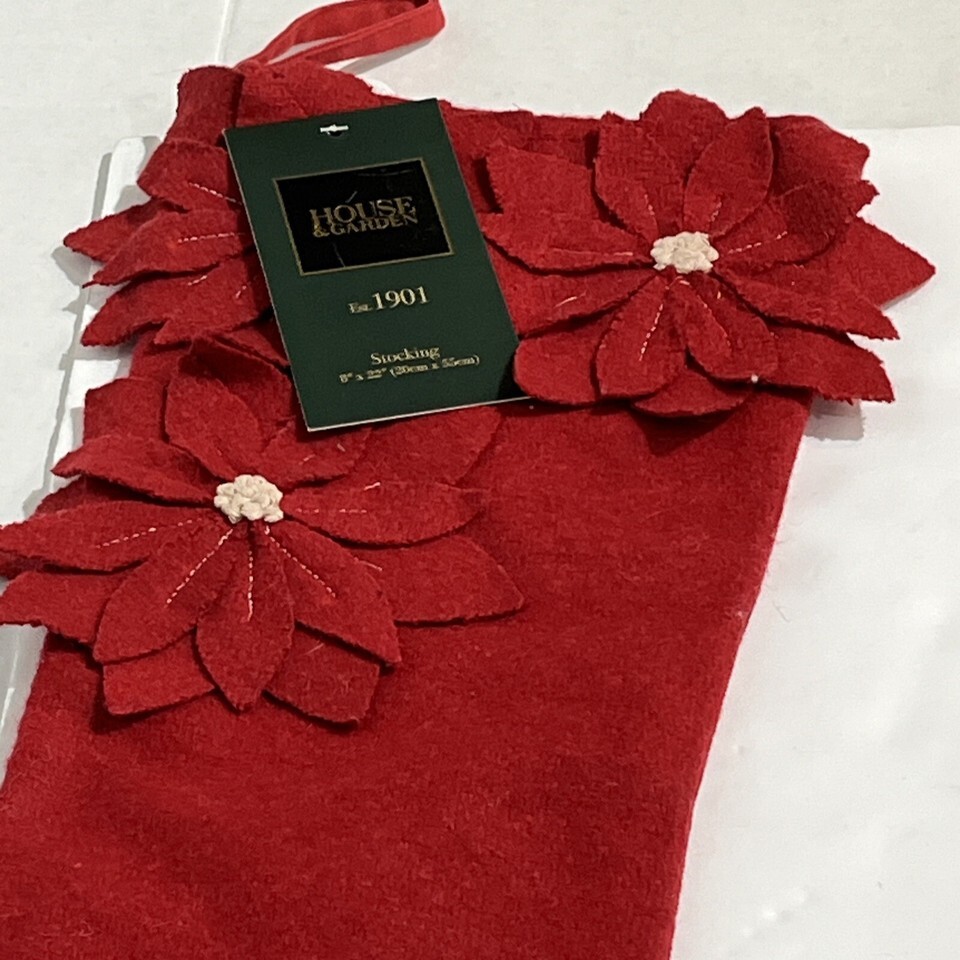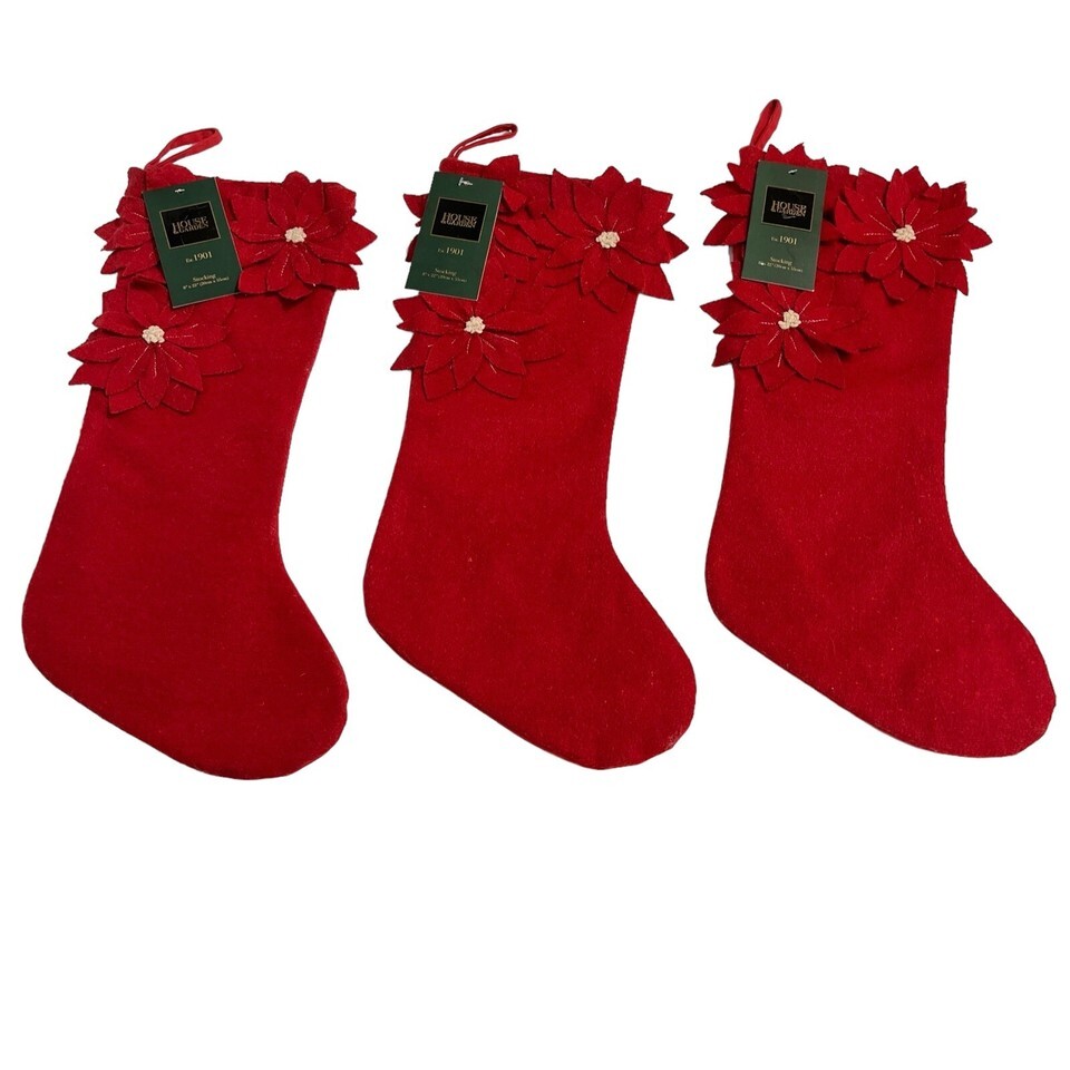 House Garden Christmas Stocking Red Wool Poinsettia Applique Set Of 3 Holiday