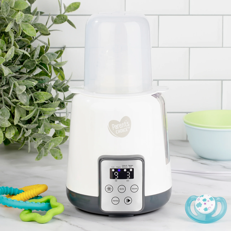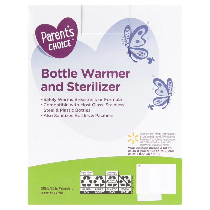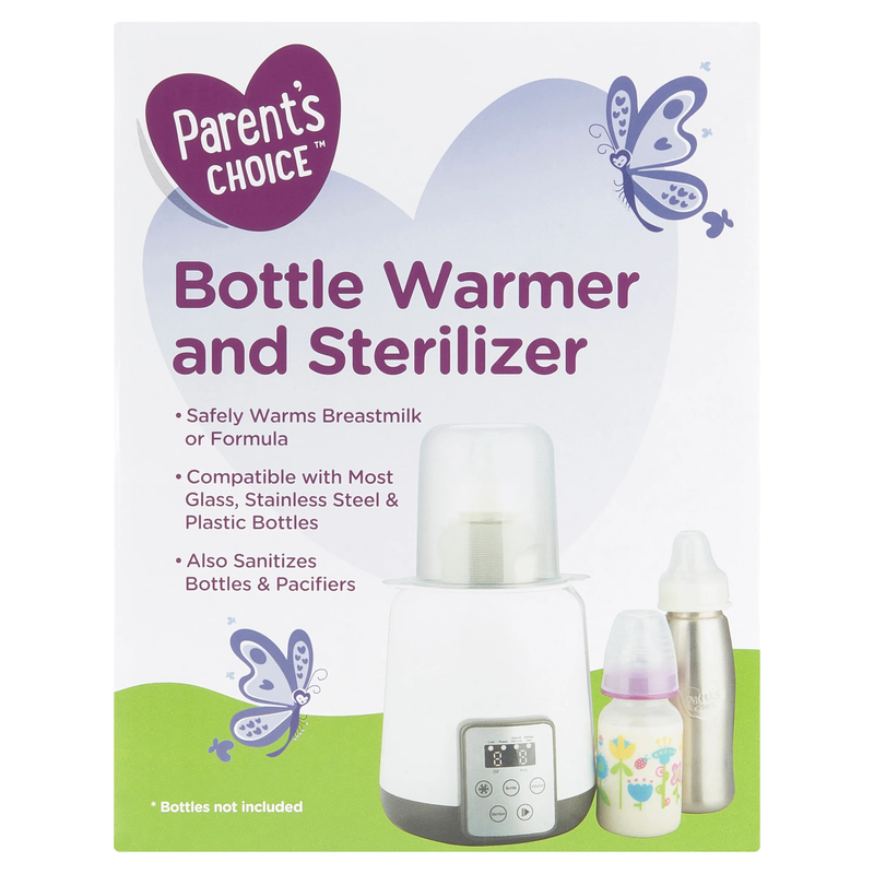 Parent's Choice Bottle Warmer and Sterilizer Safely warms bottles and sterilizes with steam Compatible with most glass, silicone, and plastic bottles Even heating to help preserve nutrients Compact and easy to store Ideal for formula and breast milk