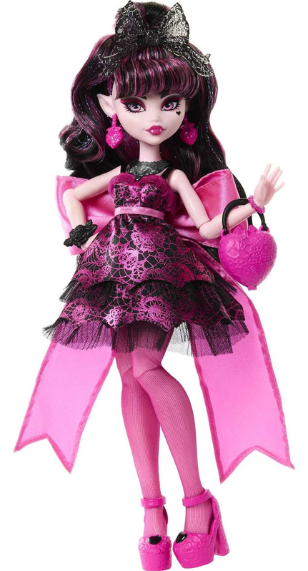 Draculaura doll arrives to the Monster Ball in scary-chic style! She rocks a party lurk that is sure to make a statement on the dire Monster High dance floor Every vampire needs an LBD: little bat dress! The fabric glimmers with a spiderweb finish, while a dramatic satin bow lends the design a ghoulishly glam aesthetic Draculaura instantly slays with her heartthrob purse. It even opens to fit her special occasion lipstick inside! Her shimmery hair is done up in a half-bun, while dangling earrings, a black corsage, pink tights and platform pumps complete her fangtastic fashion Additional storytelling accessories make for a screamtastic soiree: a group selfie to remember the night, a black rose boo-quet, a tray of shocklate strawberries and a chocolate fountain This Monster High Draculaura doll makes a creeperific addition to any skullection! Kids and fans alike can check out the other Monster Ball ghouls for more fearsome fun