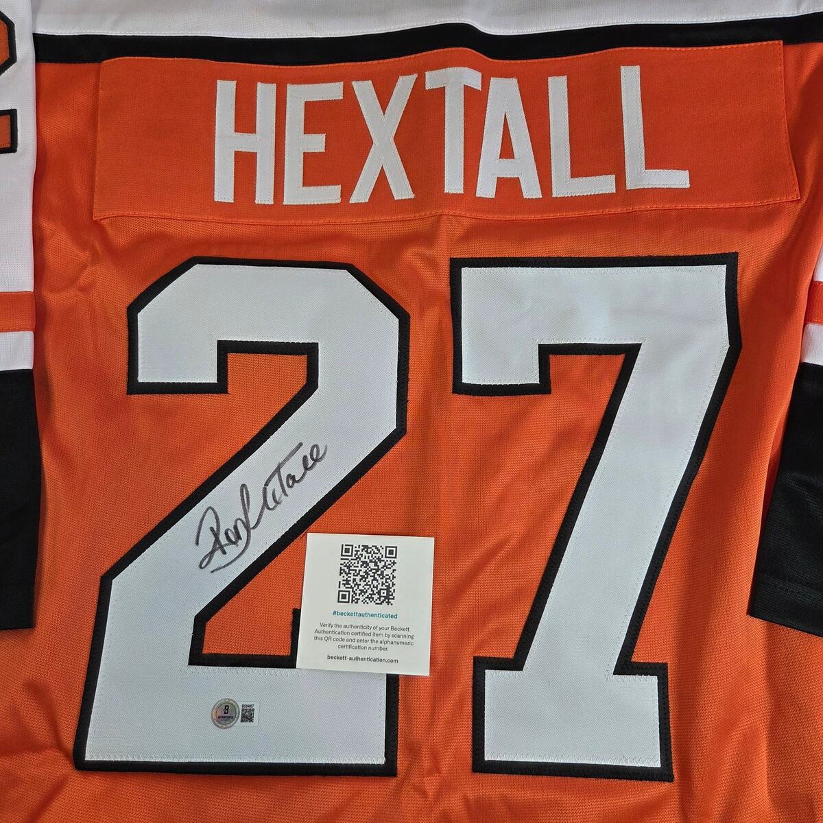 Autographed Philadelphia Flyers Ron Hextall #27 custom hockey jersey, signed in black marker on the back number and authenticated by Beckett (BAS) with matching hologram. High-quality custom fan jersey in Flyers colors with stitched name and numbers. Excellent collectible for Flyers or goalie fans.