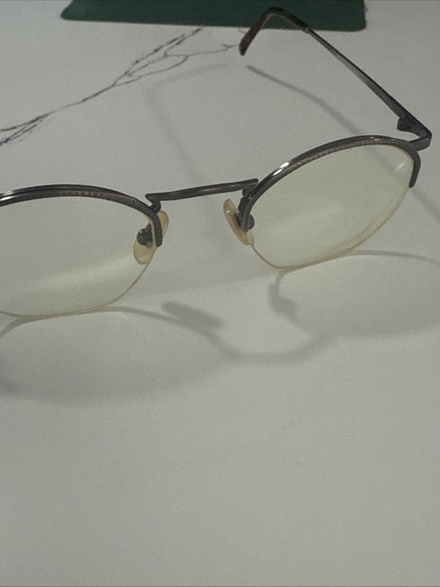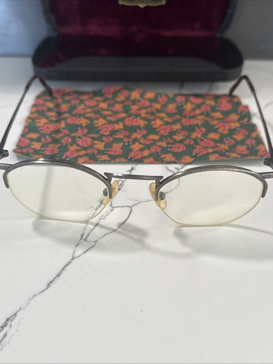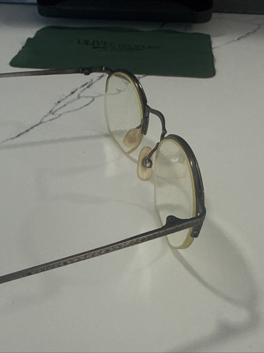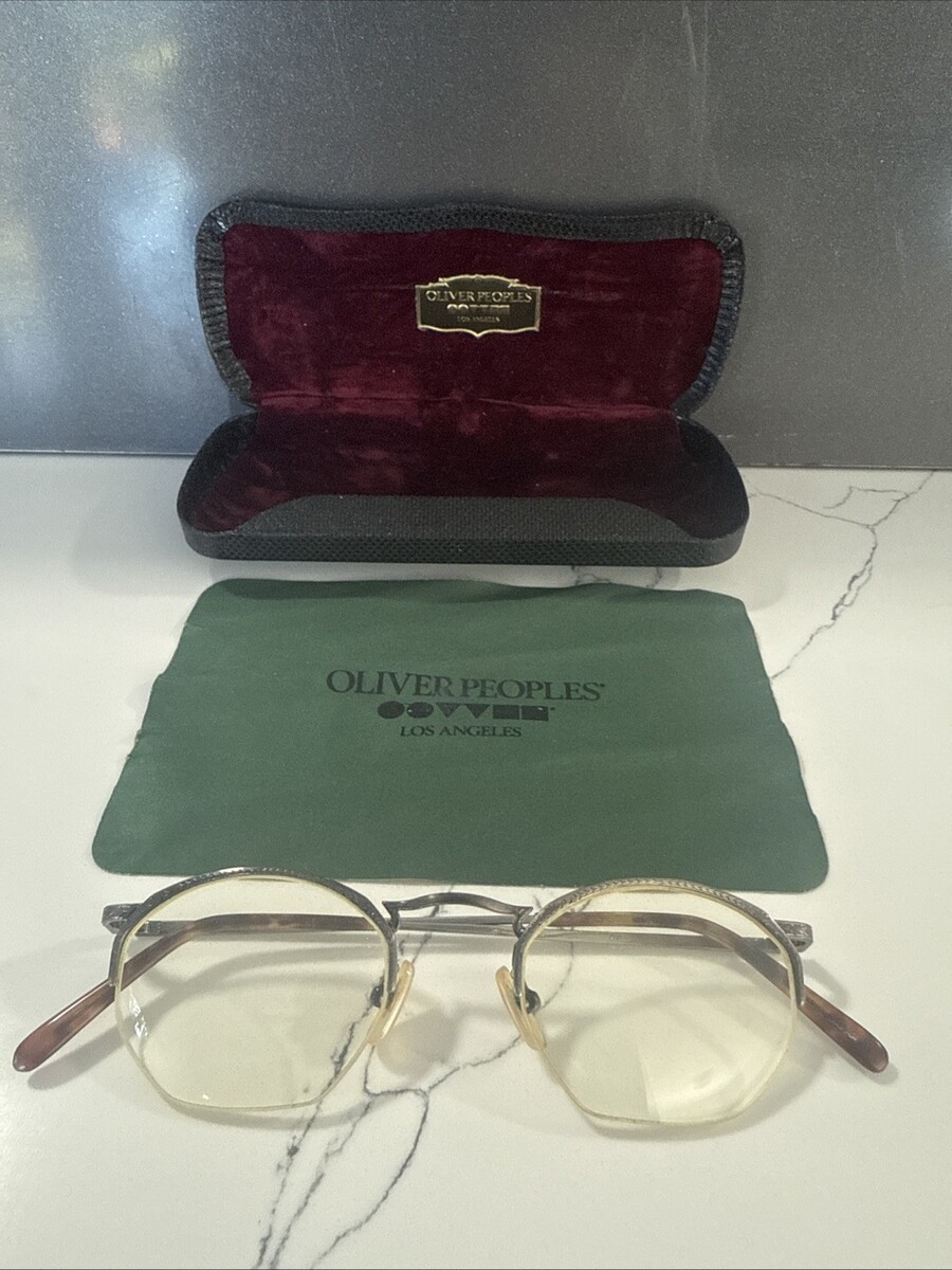 VTG 80's VERY RARE Oliver Peoples OP 57E Pewter Tooled Half Rim Eyeglasses. 54-20-135. In excellent preowned condition with original cleaning cloth and case.