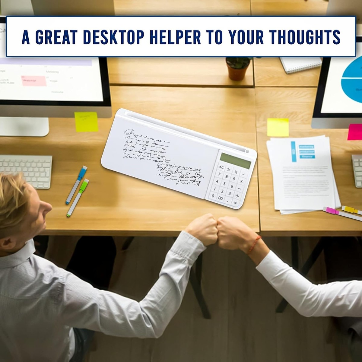 Desktop White Board with Basic Calculator ? Glass Desktop Dry Erase Board ? Home Office Study Essential Desktop Buddy ? Dry Erase Board with Phone/Tablet Slot ? Includes Sticky Notes and 8 Markers