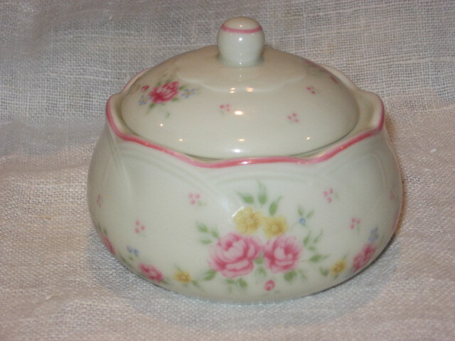 Such a pretty little thing! This dainty lidded trinket dish could sit on any vanity or be displayed in the bedroom. The floral design repeats around base. Colors are soft pinks, greens and a touch of yellow. A distinct pink line details lid and scalloped edge. The finish is a smooth porcelain. Measures 3.75" diam top X 3" diam base X 2" T. Look in my booth for other vintage dresser accessories.