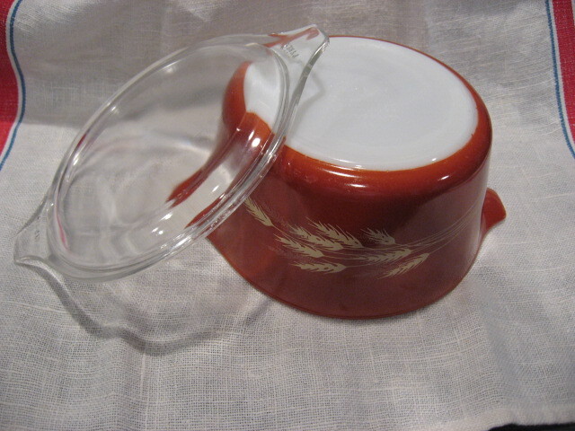 Pyrex introduced the Autumn Harvest line in 1979 and discontinued pattern in 1986. This 2 piece 1 liter set is vibrant rust and has crisp wheat graphics. No flea bites or scratches. Pyrex information appears on the bottom. Microwave, oven and dishwasher safe. Timeless kitchen charm and useful, too. Measures 7.25" diam X 4" tall. Look for other vintage kitchen items in my booth.