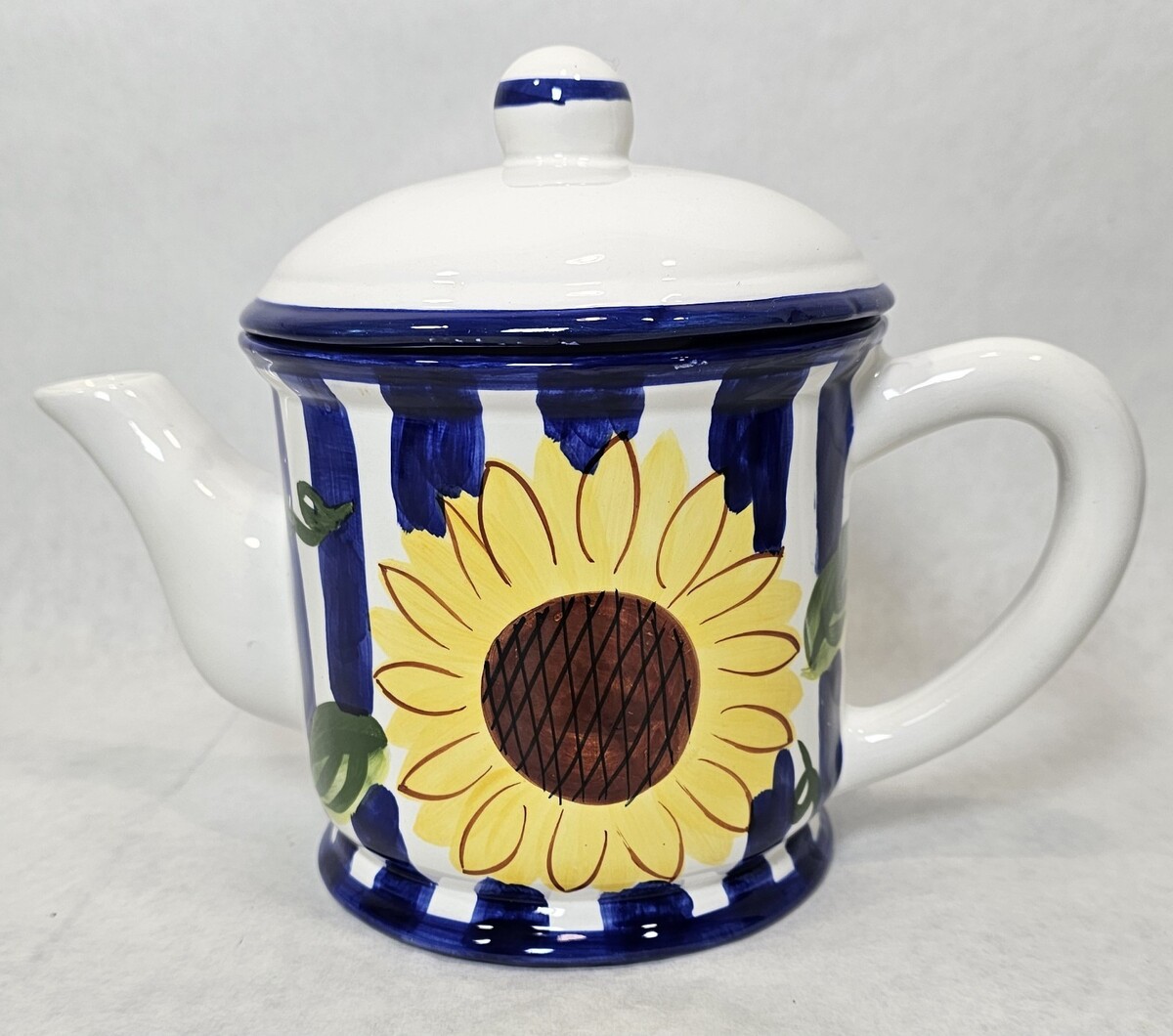 Ceramic Teapot Sunflower Blue White Striped 4 Cups