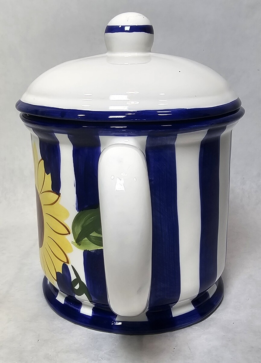 Ceramic Teapot features a blue and white striped pattern with a prominent hand painted sunflower on the side.