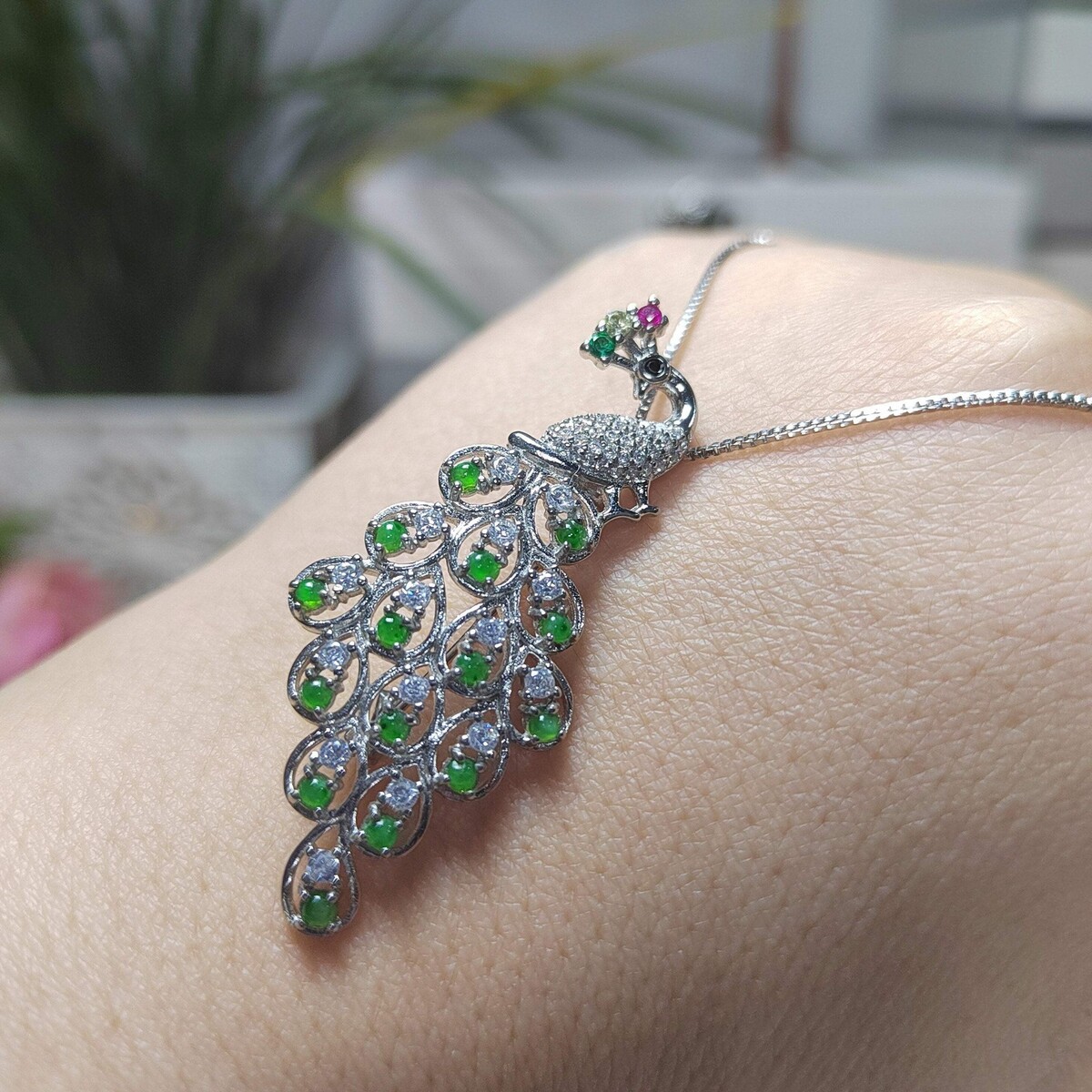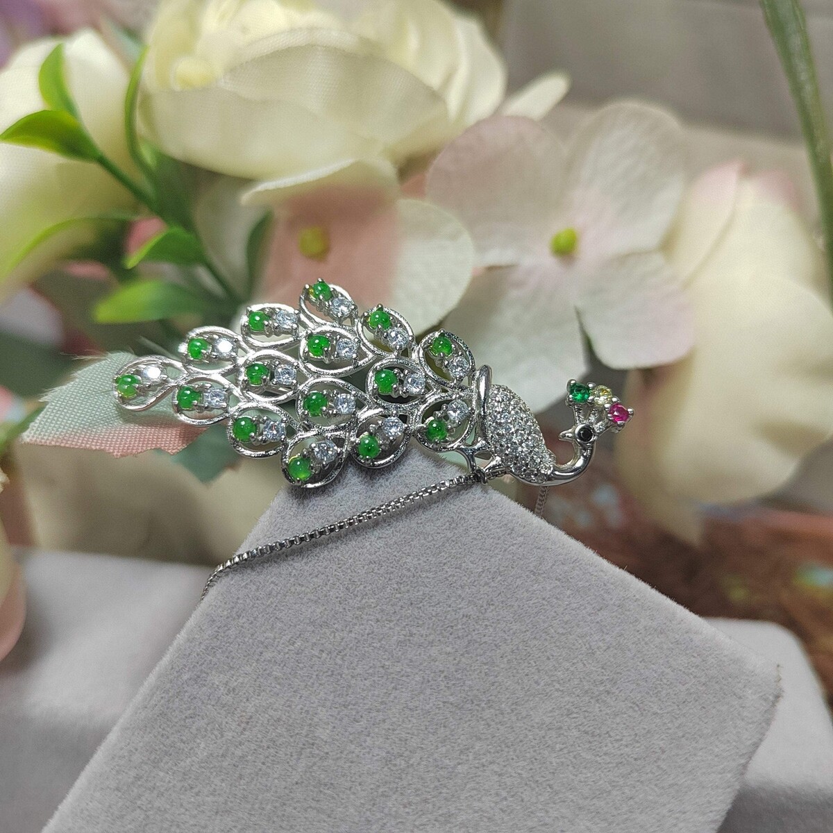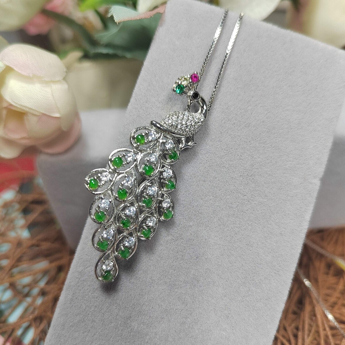 Experience this Bright Apple Green 15pcs Pendant/Brooch Untreated Jadeite with Zirconia S925 Sterling Silver settings pendant very creative but elegant design. Details: Color: Bright Apple Green Pendant Dimensions: 49.6mm x 21mm x 2.7mm(with setting) Chain Length: 45cm Chain: 925 Sterling Silver - 18K White Gold Plated Whether worn for a special occasion or as an everyday piece, this jadeite pendant is sure to draw admiration and compliments. Packing Includes: Silver Cleaning Cloth Jadeite Treatment Oil Jewelry Pouch Jewelry Box Care Instructions: To ensure your jadeite pendant retains its beauty for years to come, please follow these care instructions: Avoid Chemicals: Keep the pendant away from harsh chemicals such as perfumes, hairsprays, and cleaning agents, as they can damage the jadeite and tarnish the gold plating. Store Safely: Store the pendant in a soft pouch or jewelry box to prevent scratches and exposure to dust. Clean Gently: Clean the pendant with a soft, damp cloth. Avoid using abrasive materials or harsh cleaners. Wear with Care: Avoid wearing the pendant during strenuous activities or while swimming to prevent damage. Regular Maintenance: Periodically check the pendant for any signs of wear or damage and take it to a professional jeweler for maintenance if needed.