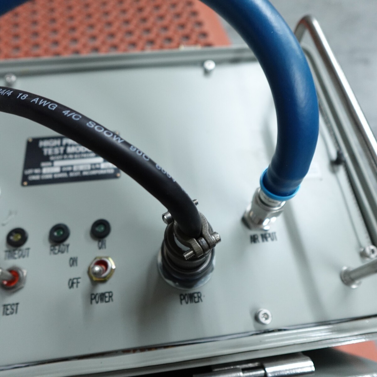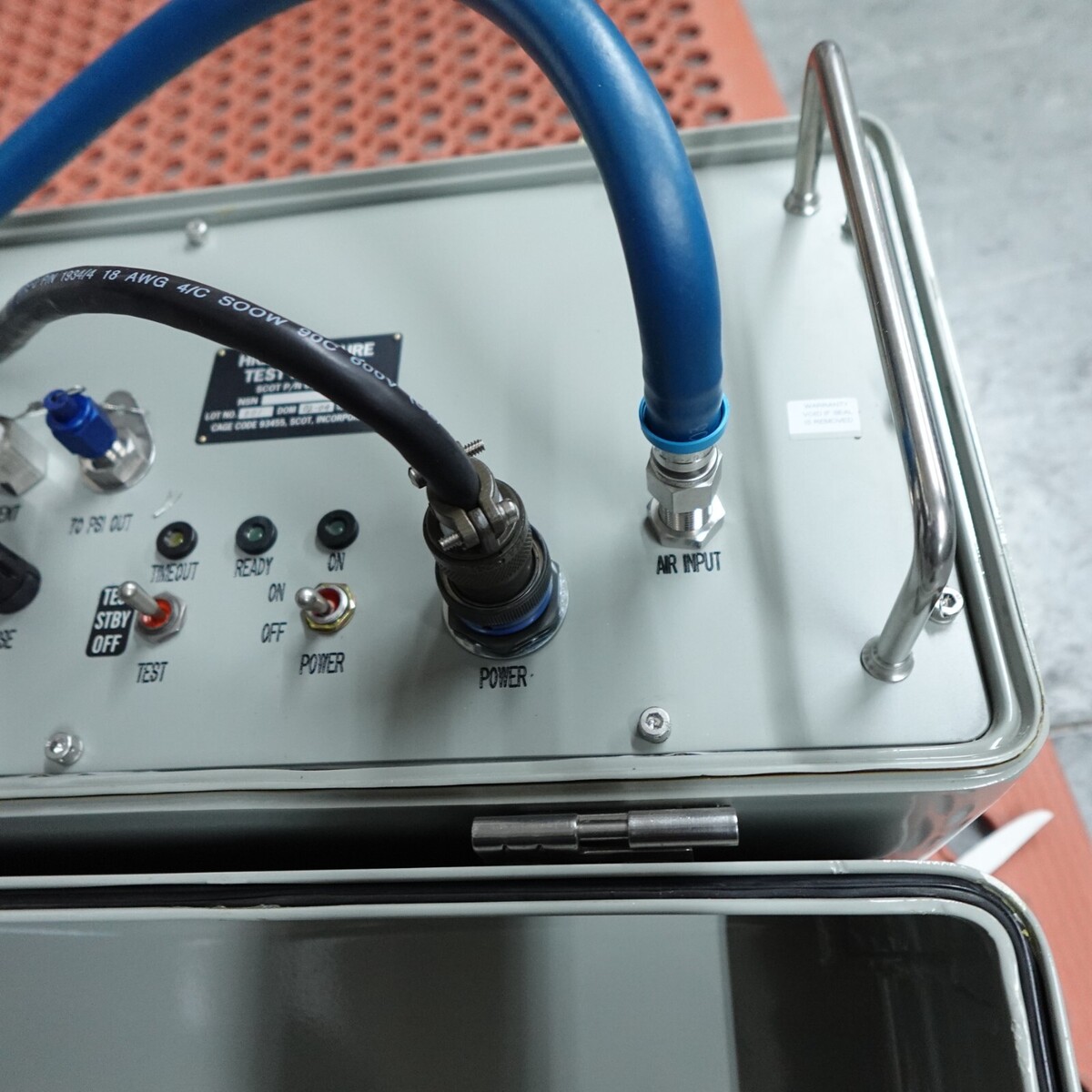 This is a rugged, aerospace-grade High Pressure Test Module designed to evaluate and verify systems under controlled air pressure environments. Originally built by SCOT, Incorporated ? a known supplier for military and aerospace applications ? this unit supports testing up to 90 PSIG, and includes: