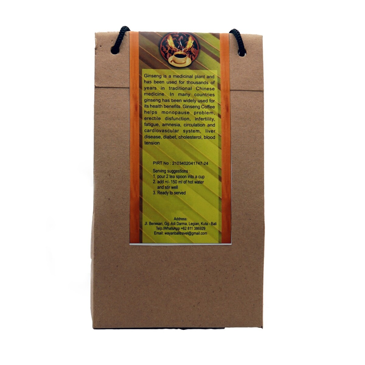 The product is Bali Ginseng Coffee by Coffee 'n SouL, a flavored medium roast coffee from Bali. It is a 100g pack of organic, sugar-free instant coffee made with natural and herbal ingredients, specifically ginseng. The packaging is labeled with BPOM certification, ensuring its quality and safety. Each pack contains 8 servings, with a serving size of 1 cup. This product offers a unique blend of Indonesian flavors and the health benefits of ginseng in a convenient and flavorful coffee experience.