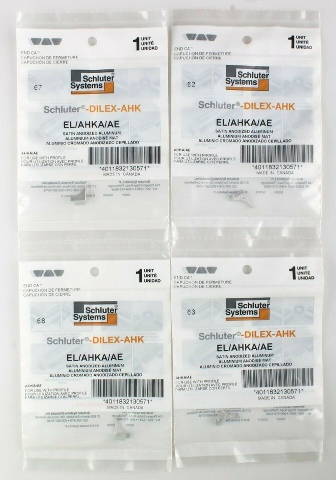 This is for a lot of Four (4) Schluter Systems EL/AHKA/AE DILEX-AHK Left Side Aluminum End Cap In factory sealed plastic bags The EL/AHKA/AE is a left end cap for the Dilex-AHKA cove-shaped profile. It is used to cover the open edge of the profile in applications where the end is left exposed. The end cap has a leg that fits into the profile and can be used with any size of the Dilex-AHKA in satin anodized aluminum. Made of satin anodized aluminum For use with Dilex-AHKA cove-shaped profile Size: 1/4 in. x 1/2 in. Finish: Satin Aluminum Left end cap Finishes the exposed profile edge Easily fits into profile for quick installation