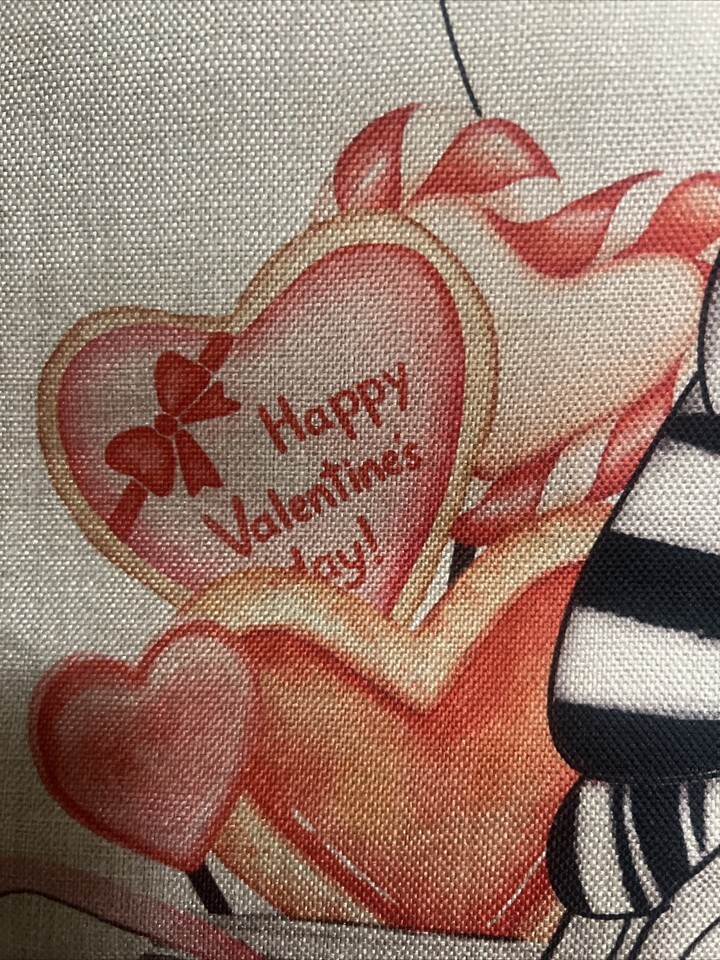 Show your love for Valentine's Day with this festive flag! Measuring 28 inches by 40 inches, this double-sided burlap flag features a heart cartoon character and the words "Happy Valentine's Day" on both sides. Perfect for outdoor use, this flag is machine washable and weighs only 10.5 ounces.