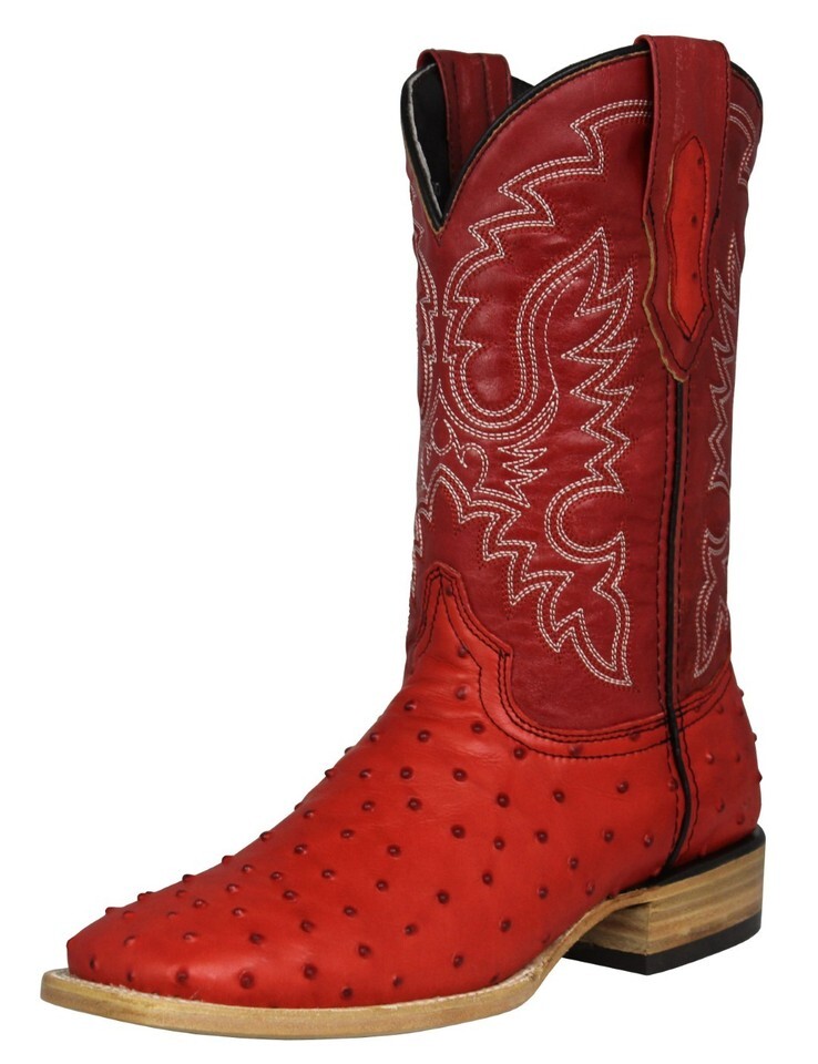 Mens Red Cowboy Boots Leather Ostrich Quill Print Western Wear Square Toe