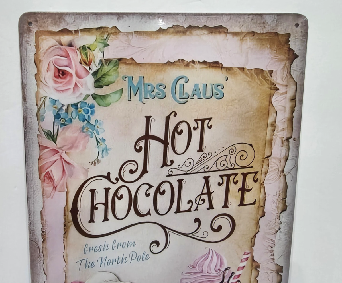 Christmas Vintage Style Mrs Claus Hot Chocolate Pink Santa Claus Tin Wall Sign