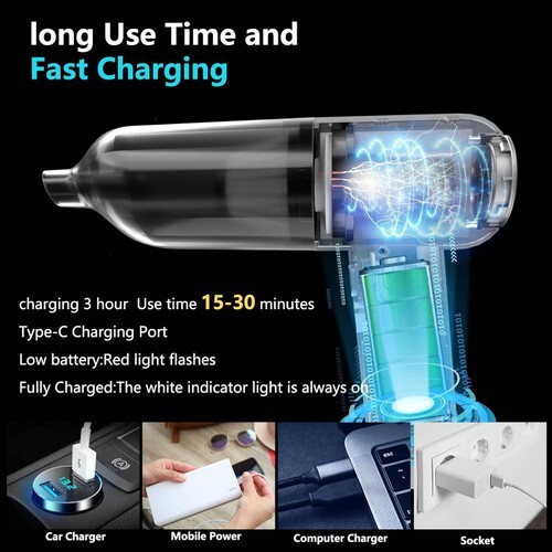 Air duster with a Type-C fast charging cable, has a built-in 5200mAh battery, fully charged within 3-4 hours (adapter is not included, can be charged by any USB charger)