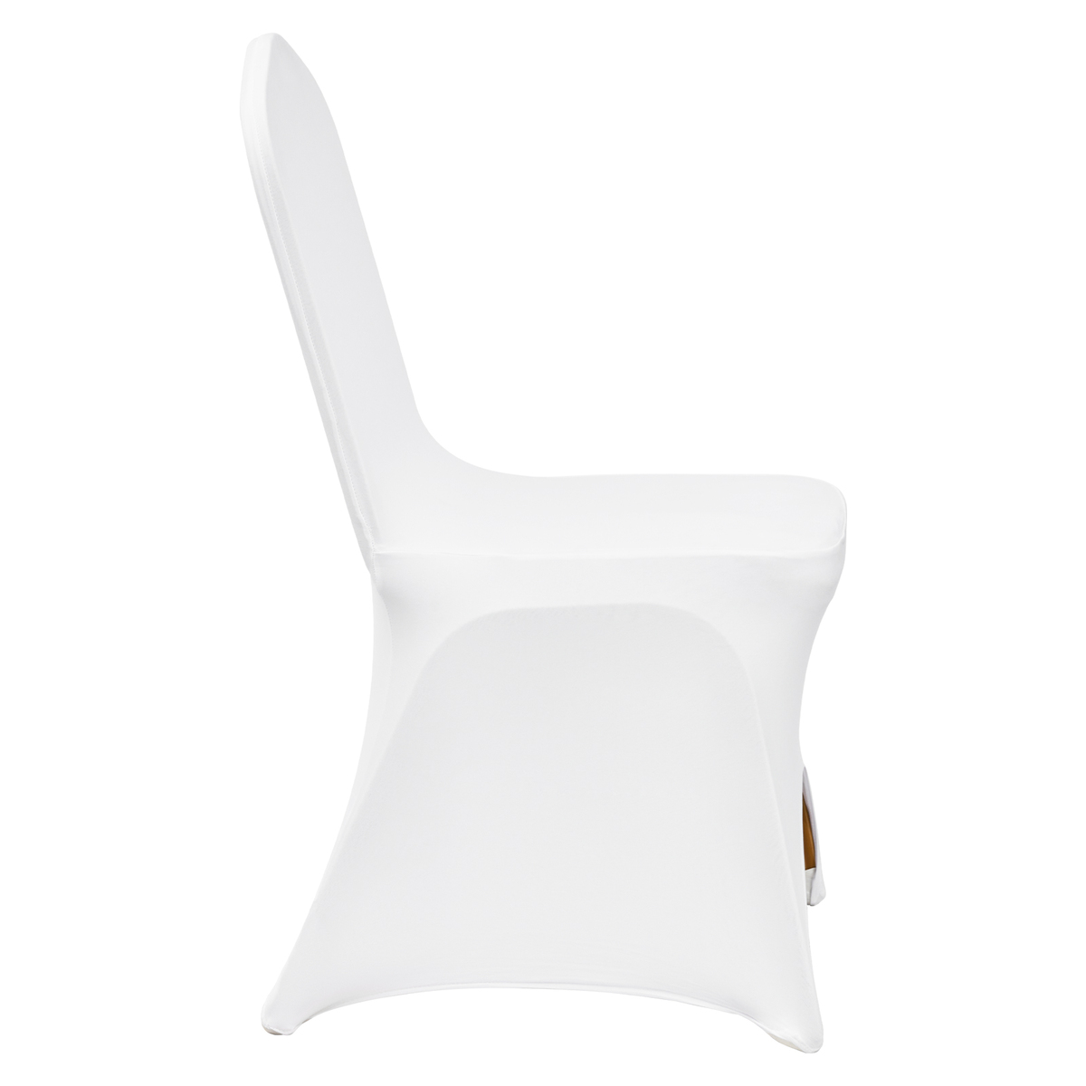 Premium Material: Color: White; Quantity per box: 100 PCS; Material: 95% Polyester Fiber 5% Spandex. Durable fabric and quality stitching offer additional comfort and elasticity. Universal spandex folding chair covers are designed to protect your chairs from accidental spills, pet scratches, everyday stains, and tears, making them ideal for both indoor and outdoor events.