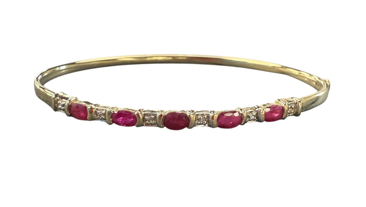 Type: BangleWeight: 3.0Karat: 14ktMetal: Yellow GoldGender: Women'sStyle: BangleSize / Length: 3"Owner applied: NaStone 1 quantity: 5Stone 1 shape: OvalStone 1 color: RedStone 1 weight (total): .50Condition:Used