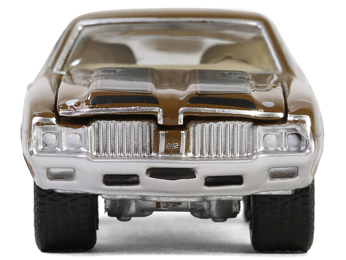 Brand new 1/64 scale diecast car model of 1972 Oldsmobile 442 Brown with Black Stripes "The Complete Escape Machine" "Vintage Ad Cars" Series 11 die cast model car by Greenlight. Limited edition. Brand new box. Detailed exterior. Real rubber tires. Has opening hood. True-to-scale detail. Authentic decoration. Comes in a blister pack. Officially licensed product. Die-cast metal body and chassis. Manufacturer's original unopened packaging. Dimensions approximately L-2.75 inches long.