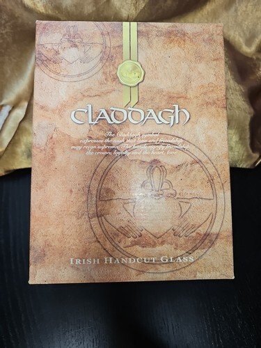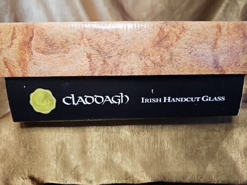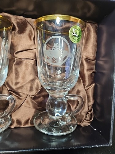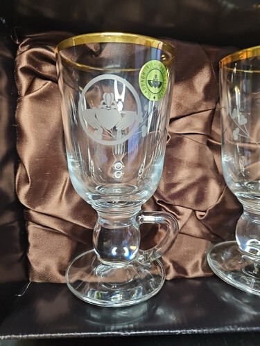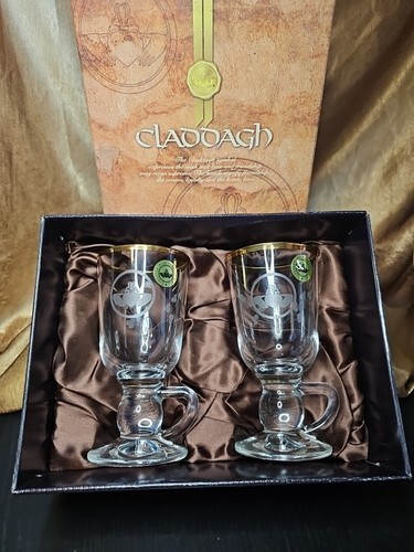 UP FOR SALE: Claddagh Irish Handcut Glass Gold Band Footed Mug Cup with Handle Boxed Set of 2