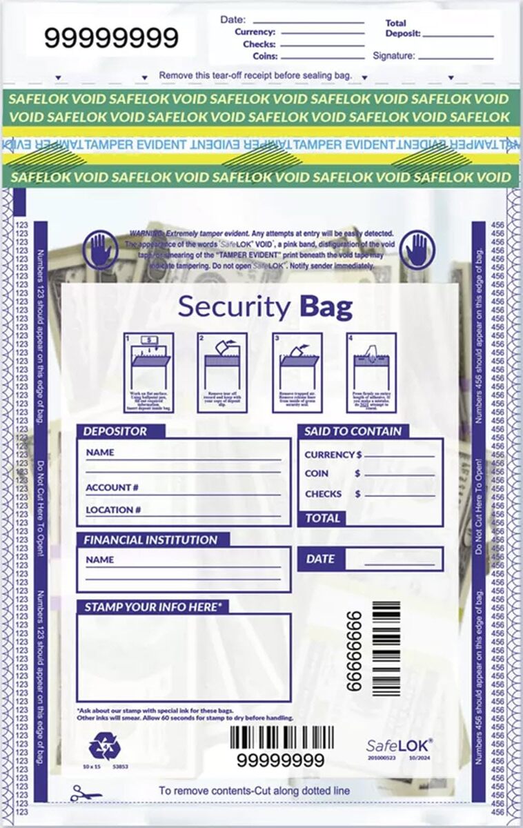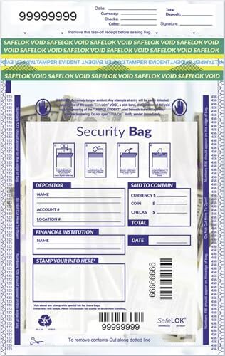 Product description: Make deposits after-hours, and protect deposits from theft with heavy duty bags that meet all Federal Reserve guidelines! Tamper-evident tape closures and additional features protect against theft or alteration. Functional and eco-friendly. All-clear #4 recyclable plastic with single pocket. Easy to use. Unique serial # printed on bag and receipt. Handy. The release liner is also the deposit bag receipt. 100 bags per unit
