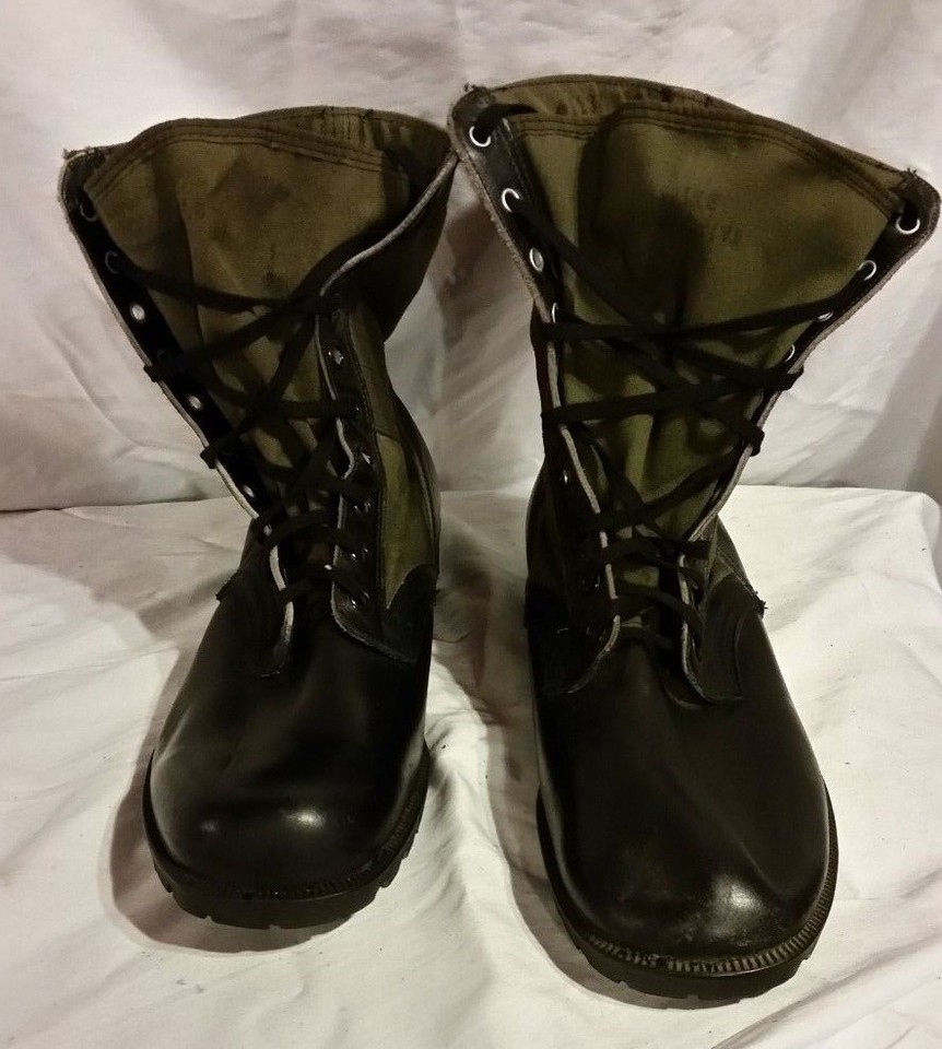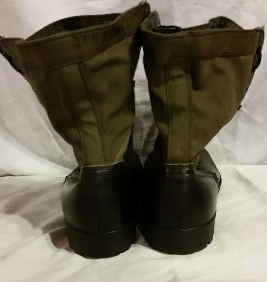 THERE IS SOME SCUFFING HERE AND THERE, PLEASE KNOW THAT THESE ARE THE ORIGINAL GREEN JUNGLE BOOTS USED DURING THE VIETNAM CONFLICT, OPERATION JUST CAUSE IN PANAMA, OPERATION URGENT FURY IN GRENADA, THEY HAVE BEEN IN A DUFFEL BAG OR IN A BOX IN A CLIMATE CONTROLLED STORAGE UNIT FOR OVER 55 YEARS, THEY ARE NOT IN PERFECT CONDITION, THEY ARE NEW OLD STOCK. AS A FELLOW VETERAN YOU KNOW THE BEST WAY TO MAKE SCUFFS GO AWAY AND THATS WITH GOOD OLD BLACK SHOE POLISH AND HOT WATER , THE SOLES ARE 100 PERCENT AND READY FOR A 20K MARCH. AGAIN THESE ARE NEW AND THE ORIGINAL 1963- 1968 ISSUED GREEN HOT WEATHER JUNGLE BOOT. PLEASE TAKE A LOOK AT MY PICTURES AND KNOW YOU ARE GETTING THE REAL DEAL .