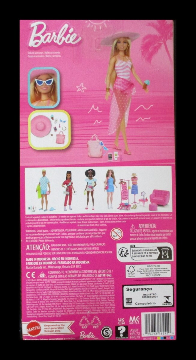 The Mattel Barbie Beach Themed Doll for 2022 features a blonde Barbie doll with straight hair and blue eyes. She comes with a bathing suit and beach accessories, perfect for imaginative play by young girls. This 12-inch doll, part of the Mattel Barbie Beach product line, is designed for play and represents a Caucasian character in the Barbie franchise. Made in Indonesia, this doll embodies a light complexion and exudes a carefree beach vibe, making it a coveted addition to any Barbie lover's collection. Same or next day ship.